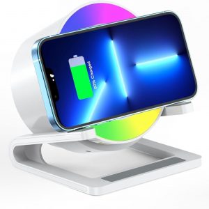 POSVIU Wireless Bluetooth Speaker with RGB Light, Skywheel 15W Wireless Charger Ambient Lamp & Phone Holder, Bedside Night Light for Bedroom, Gift for Teen Kids (Battery Included)