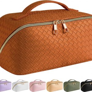 SFXULIX Large Capacity Travel Cosmetic Bag – Makeup Bag, PU Leather Waterproof Cosmetic Bag, Women Portable Travel Makeup Bag With Handle and Divider Flat Lay Makeup Organizer Bag (Brown)