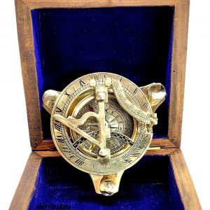Brass Golden Sun-Clock Compass with Wooden Box Vintage Nautical Sundial Compass