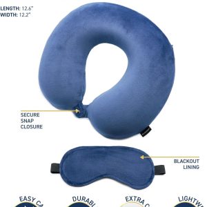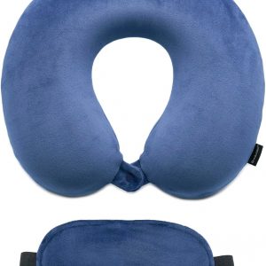 Brookstone Memory Foam Neck Pillow Travel Set with High Density Memory Foam Neck Pillow and Sleep Eye Mask for Vacations, Airplanes, Trains, Buses and Cars, Blue