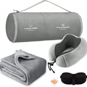 Travel Pillow and Blanket Set Neck Pillows Travel Essentials with Sleep Mask for Airplane Car Memory Foam Grey