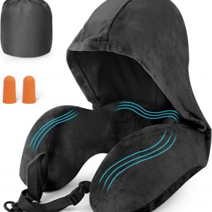 Travel Neck Pillow with Hood – Adult Travel Must Haves Airplane Hoodie Pillow, Premium Quality Memory Foam, Fit for Office, Car Ride, Sleeping. Kit with Earplugs, Luxury Bag(Ebony, L)