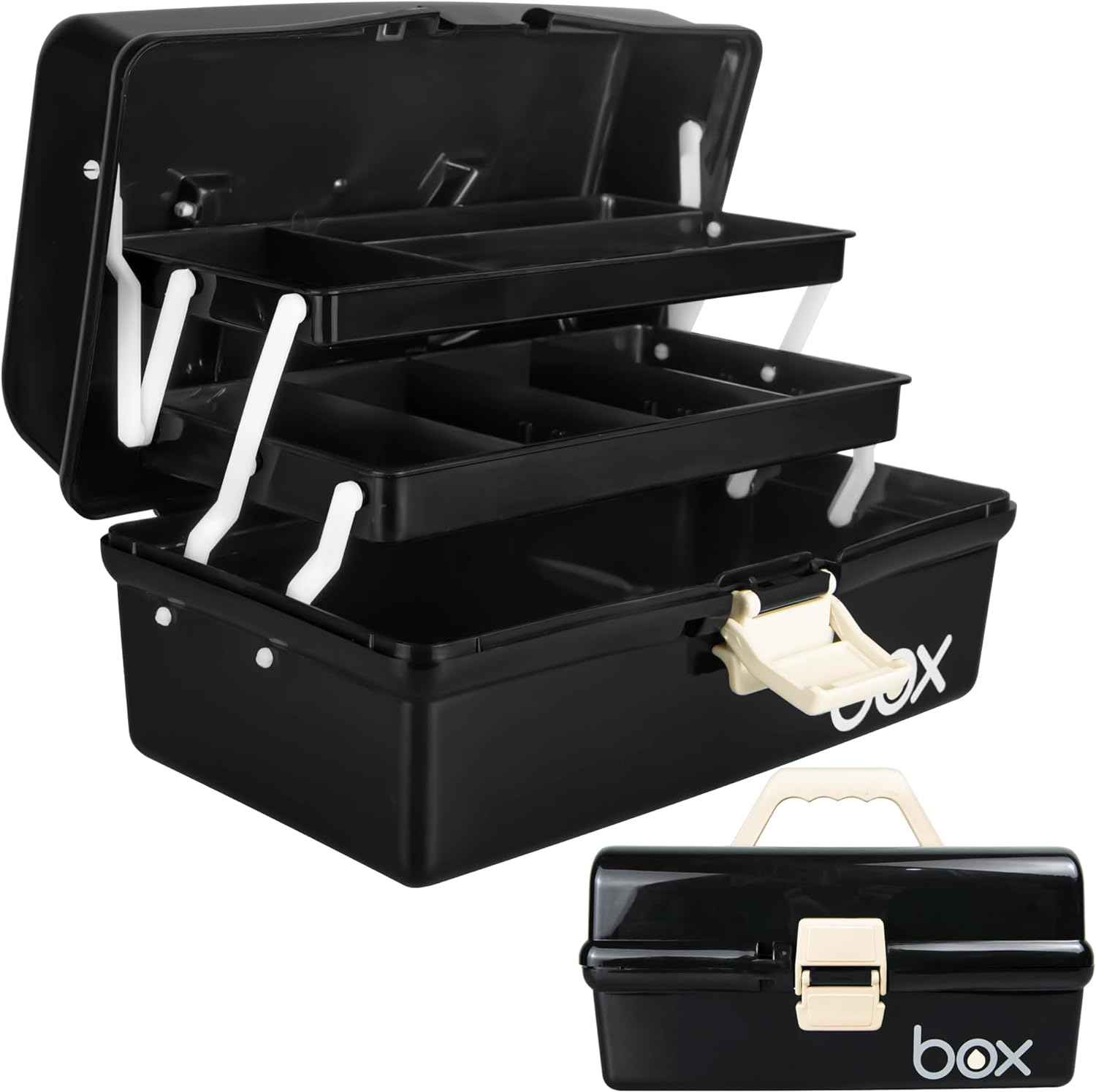 The trays are attached to the makeup case itself by some brackets, and retract/open up to reveal each layer when you open the lid.After the storage box is opened, it will lie on the table steadily, no need to worry about tipping over when picking up items.