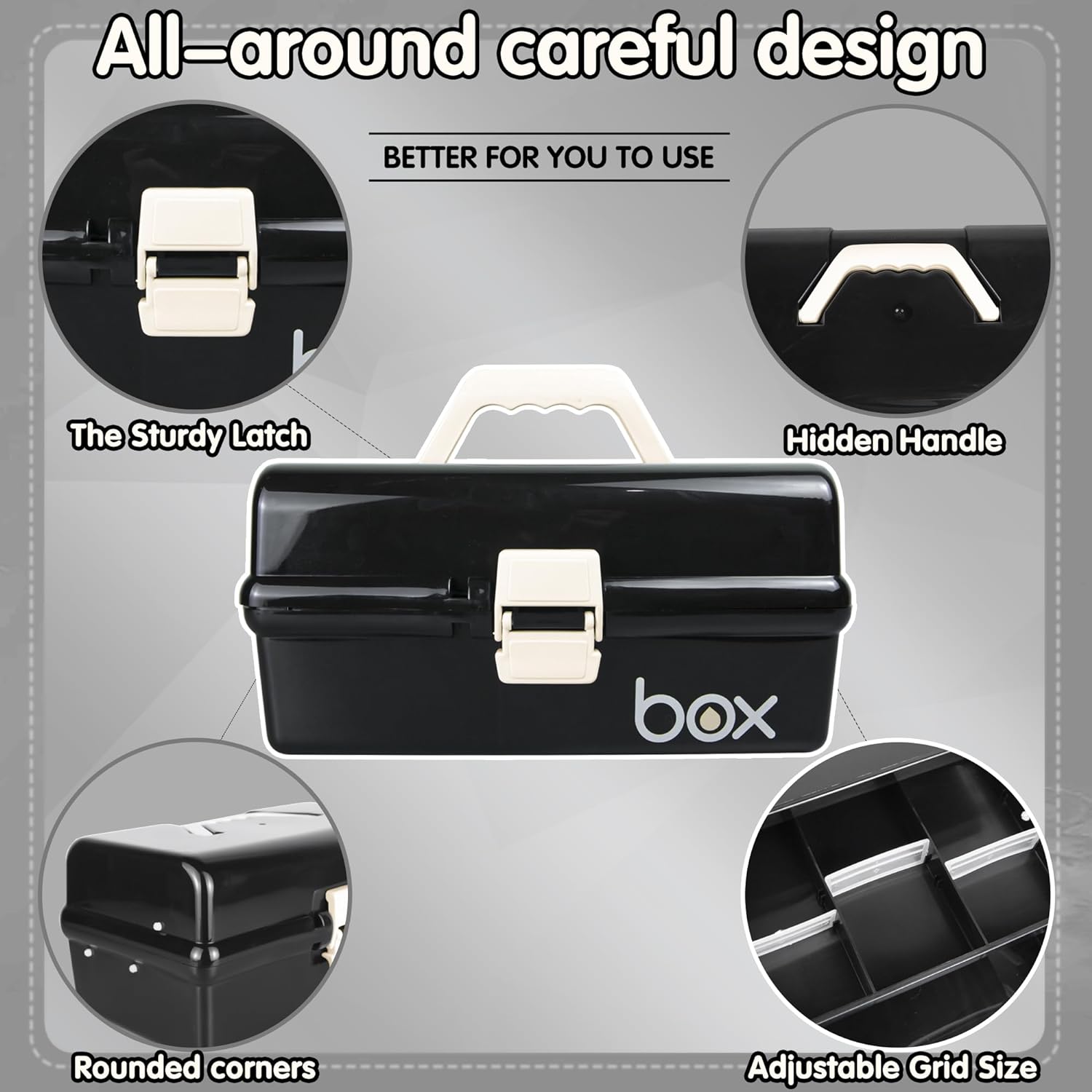 The plastic storage box with handle to keep your essentials organized, completely solve the disorder of items.Discover more storage possibilities, such as craft storage box, sewing box, hair accessories organizer, nail supplies box, Makeup Supplies organizer, etc.
