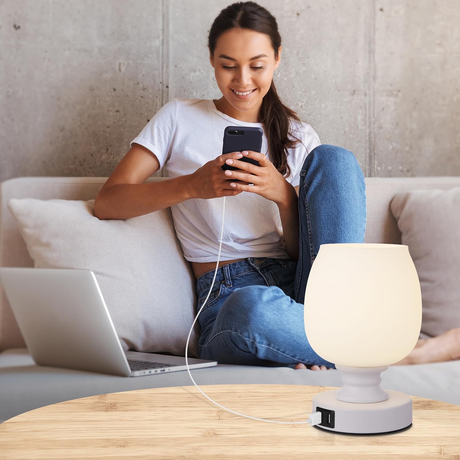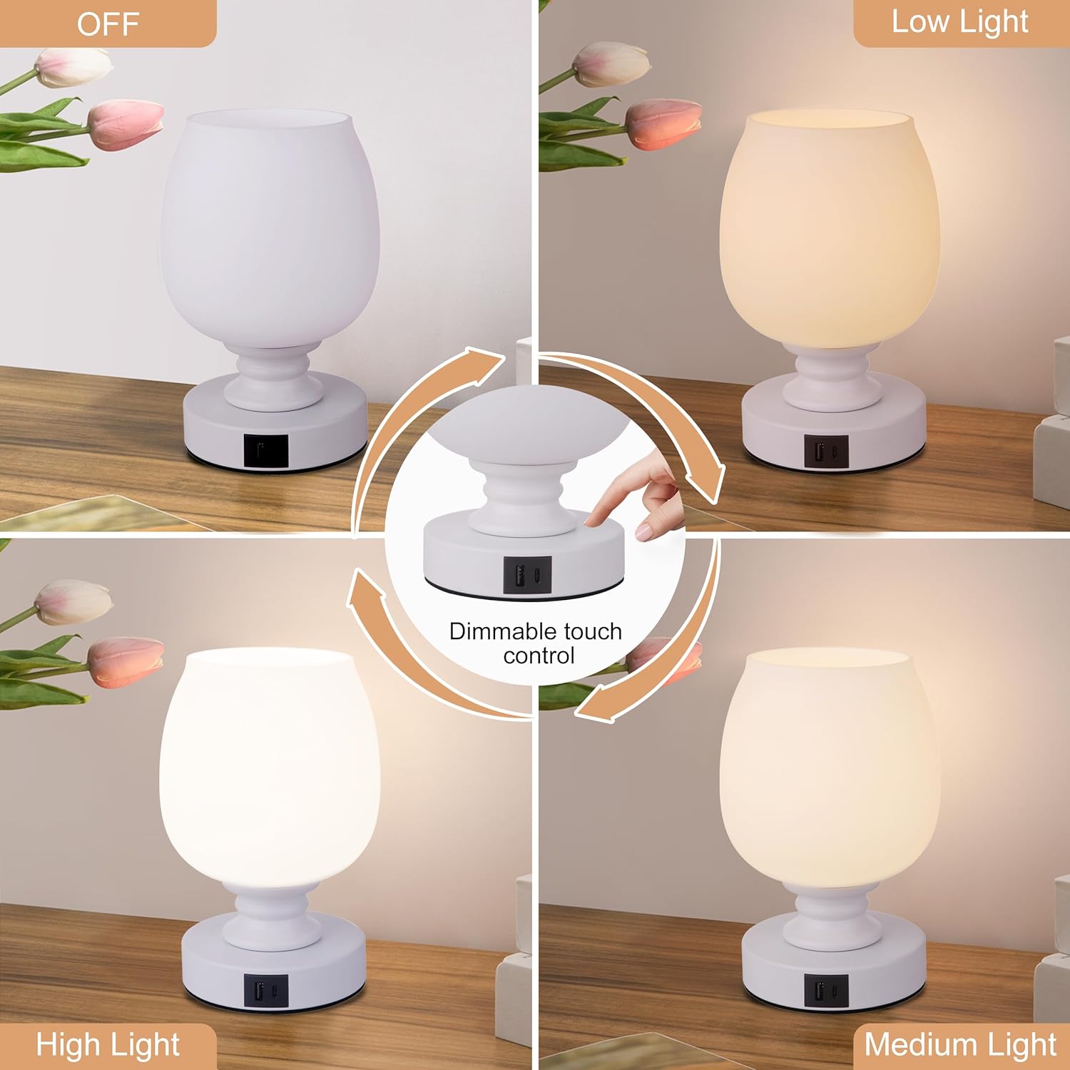 850 lumens bulb and 3 level touch dimmable: Package include a 9 W dimmable bulb, A19 shape and 850 lumens (75W incandescent bulb equivalent) dimmable, you can get 30%-60%-100% brightness level by touch the lamp base.
