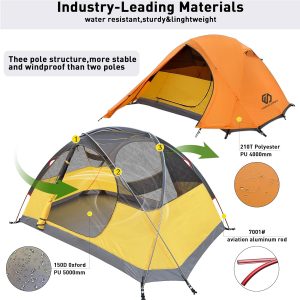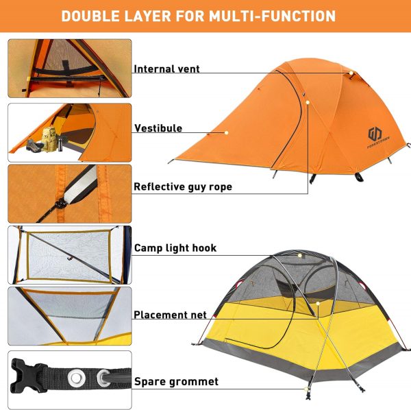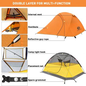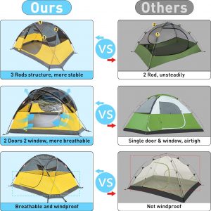 【Good Ventilation】The camping tent has double layer mesh & fabric 2 doors and 2 vestibules offering great air circulation. Efficiency ventilation can reduces condensation. Please note that not to let the inner and outer sheet fit together to prevent condensation water from moistening the inner tent.