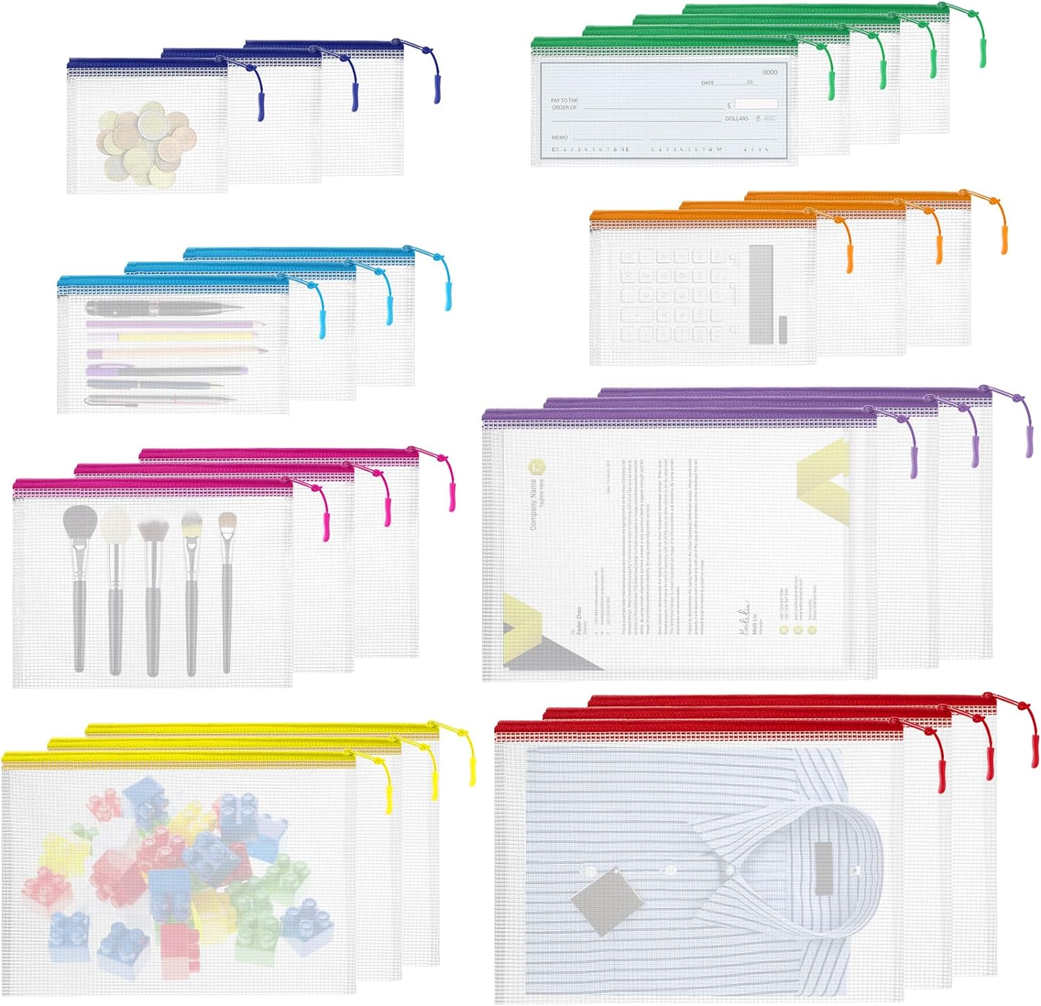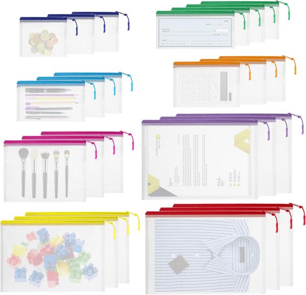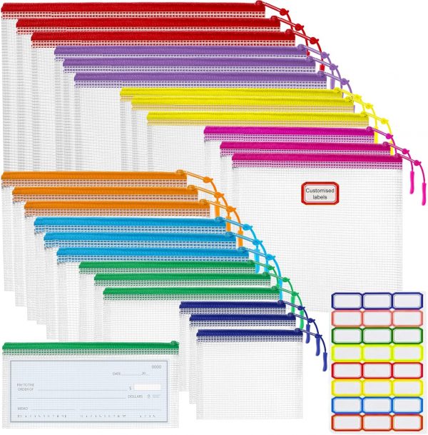 🌸What You Will Get: 25pcs zipper organizer bags. 3*B4 (14.9*11 inches), 3*A4 (13.1*9.4 inches), 3*B5 (11.6*8.2 inches), 3*A5 (9.4*6.8 inches), 3*B6 (7.6*5.5 inches), 3*A6 (7.2*4.5 inches), 4*Bills (9*4.3 inches), 3*B8 (5.1*4.5 inches),come with small colored stickers to mark the contents and help you easily keep track of the items inside
