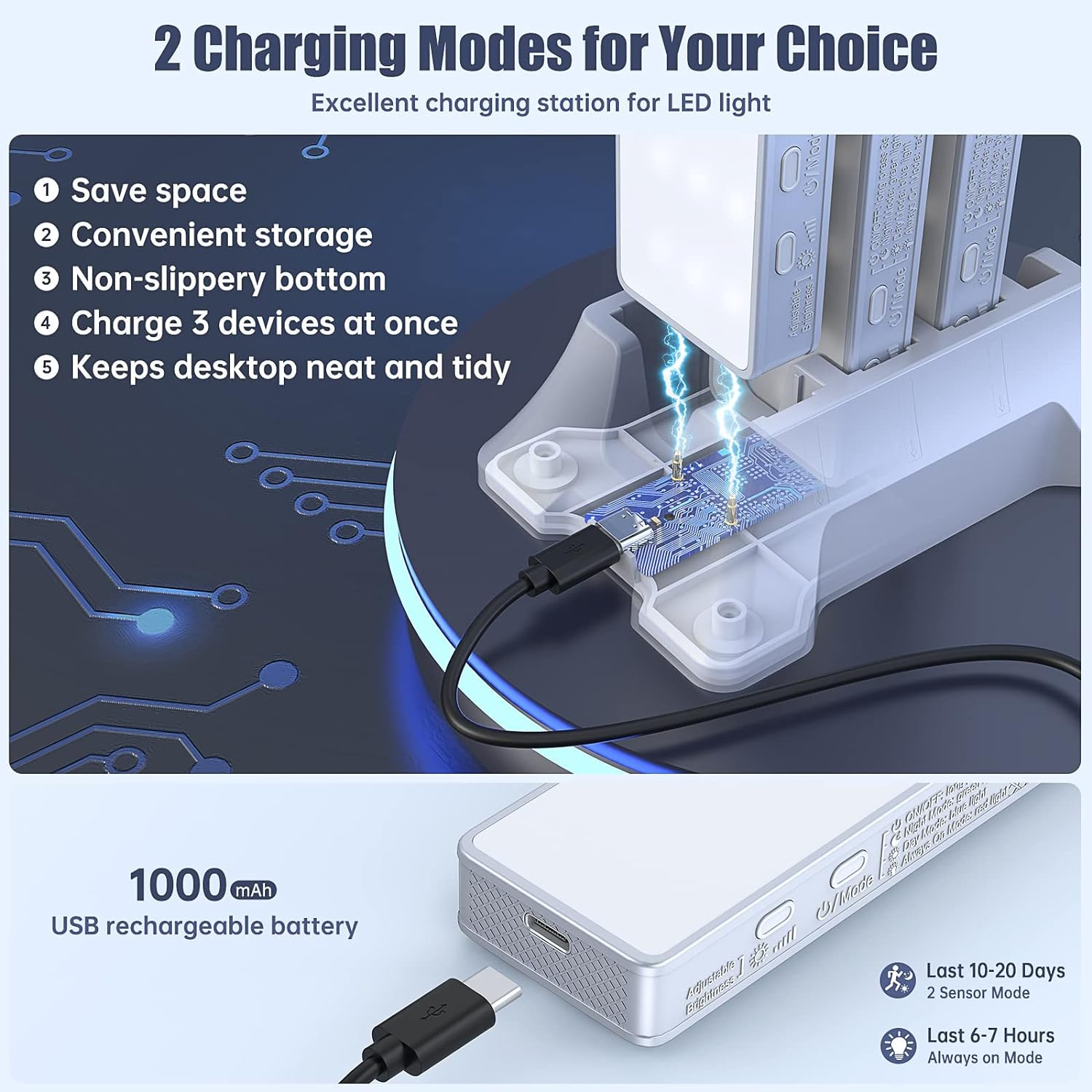 🔋【 STORABLE MULTI-DEVICE CHARGING STATION 】: The Upgrade organizer charging stand can charge three LED homelife lights at once after connected the USB cable, and you can also charge each motion sensor closet light individually; It’s not only a charging stand, but also a good helper for storage space and keeps your desktop neat and tidy, which is the first charger designed for LED Closet Light on the market; Non-Slippery bottom prevents the charging station from sliding