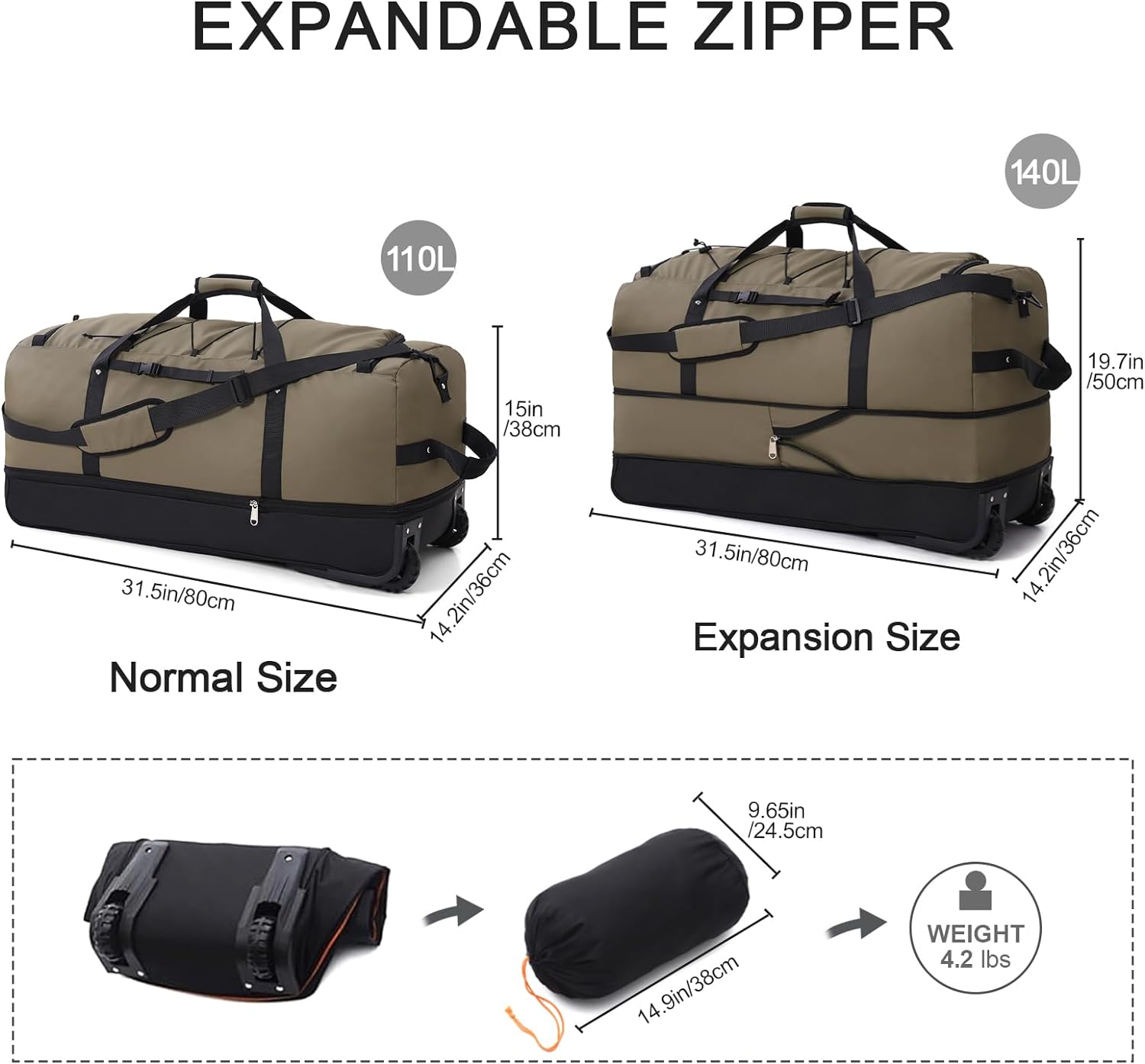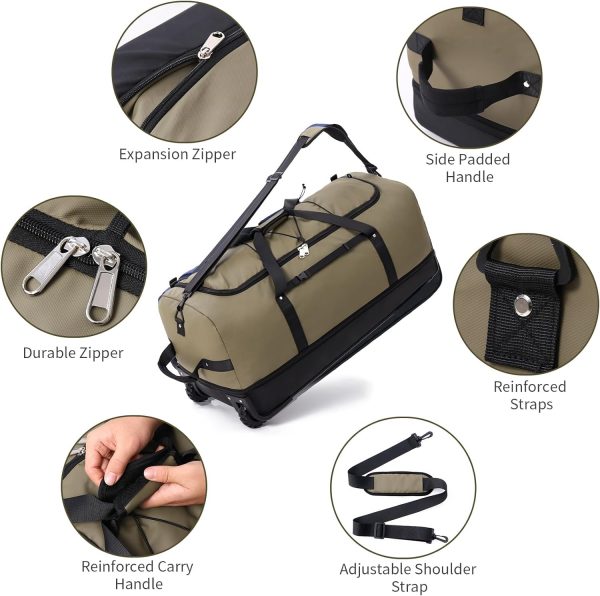 32” Foldable Duffel Bag with 2 Wheels,110L 140L Expandable Rolling Travel Bag with Multiple Compartments,Army Green