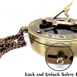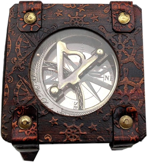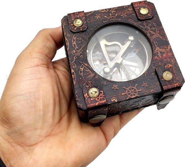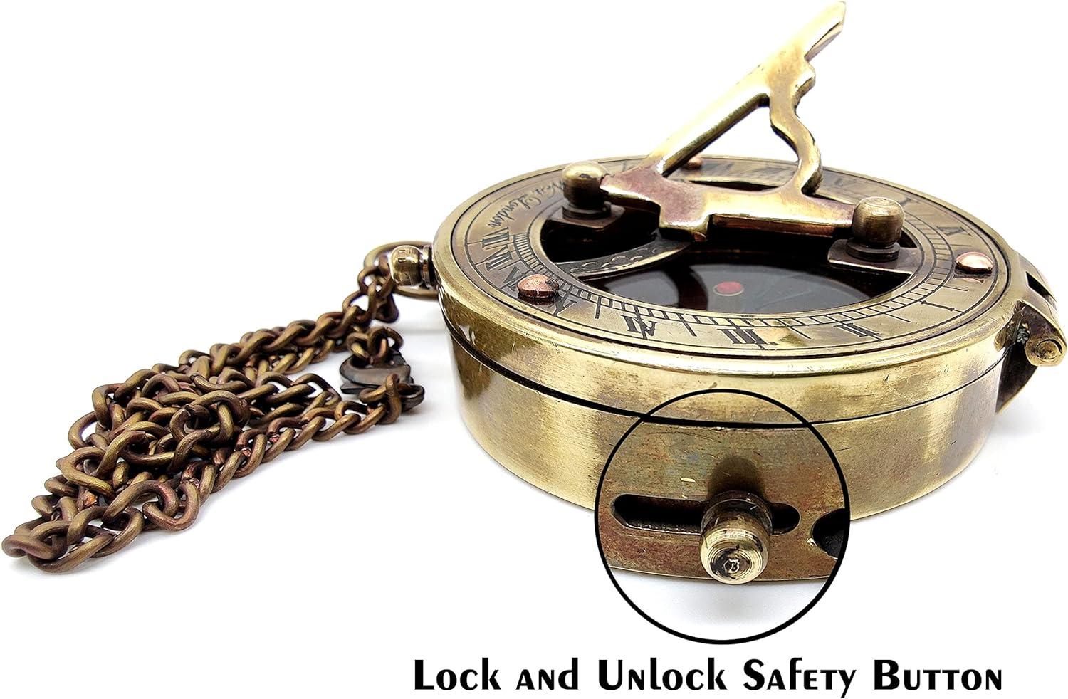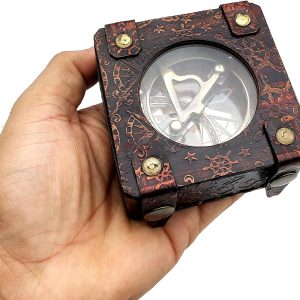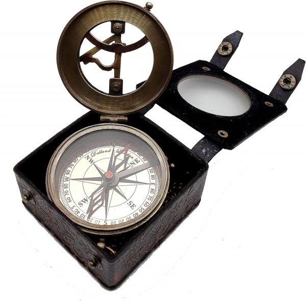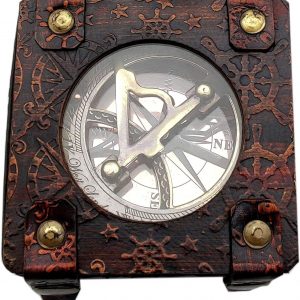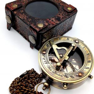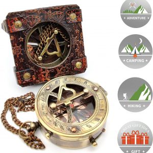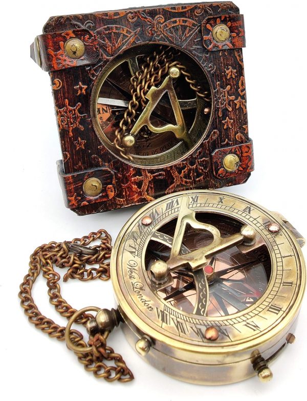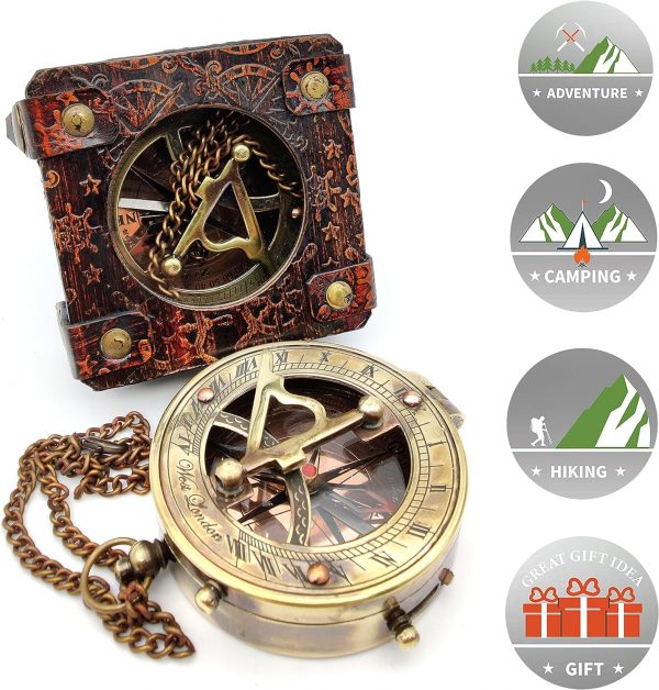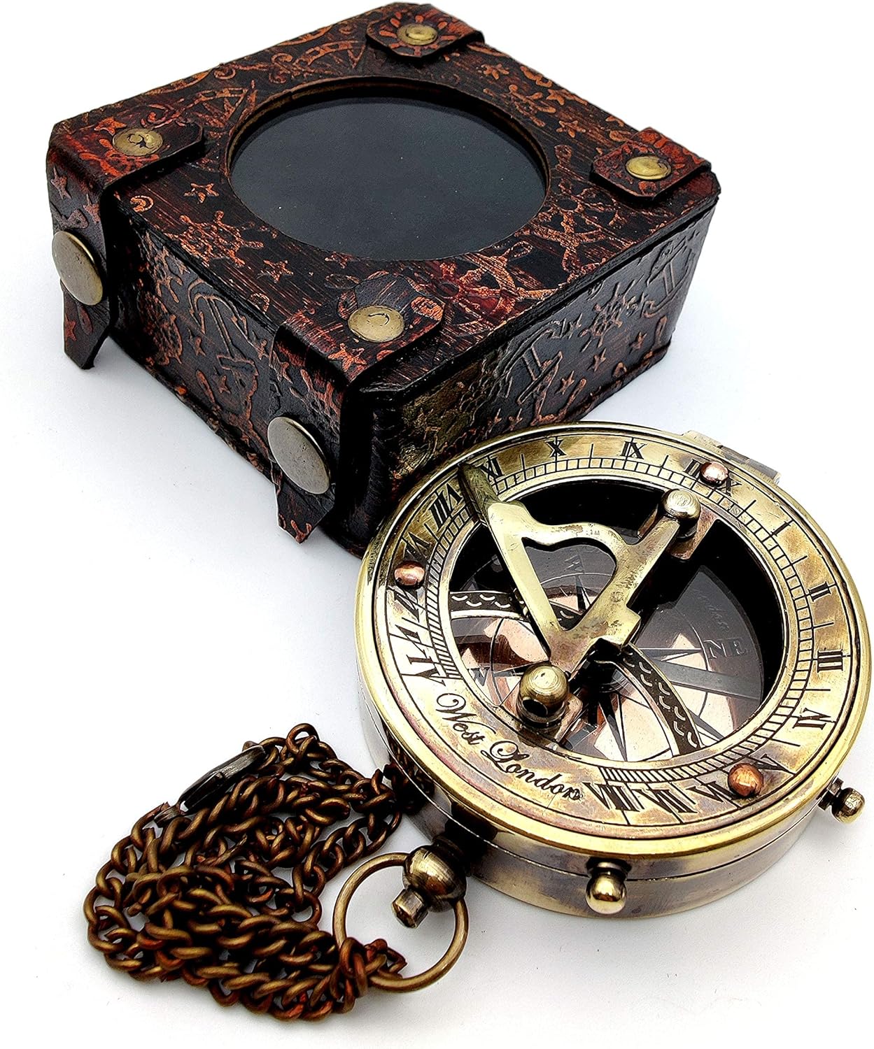 5MoonSun5’s Antique Brass Sundial Compass Marine Boat Gift Pocket Sun Dial in Leather Display Box Nautical Marine Gift Sun Clock Pirate Ship Replica Watch Steampunk Accessory