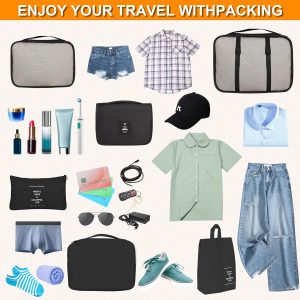 【9PC Black Set Large Capacity】Different sizes of travel essential bag sets can store classified clothes, dirty clothes, bras, underwear, footwear, cosmetics, towels, toiletries and electronic accessories. It is a good travel companion.