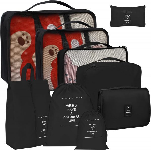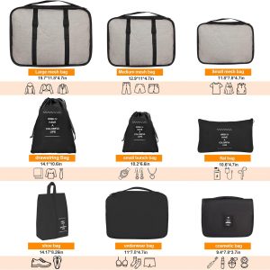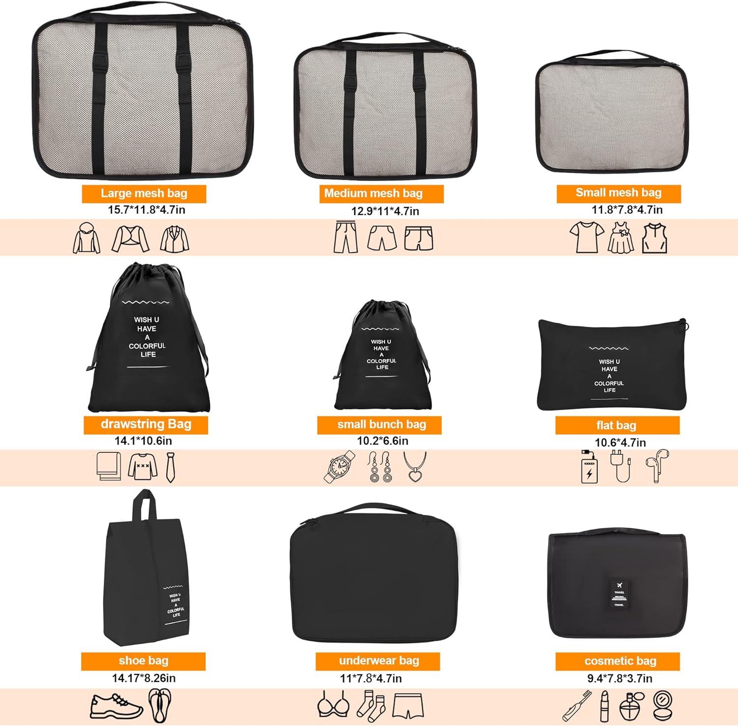 【Avoid Overweight Charges】9PCS different sizes of packaging, suitable for suitcases, handbags, weekend travel bags, backpacks and duffel bags carried by most airlines. A great way to stay organized for family holidays, business trips, backpacking, camping, hiking, motorhomes, cruise vacations and saddle bags. Take 1 cube with you as a carry-on item to reduce the weight of your checked baggage.