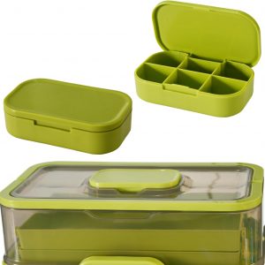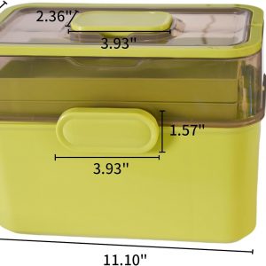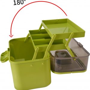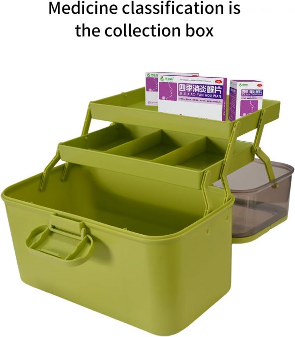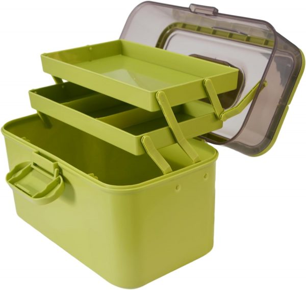 Three Layer Plastic Storage Box: It has 3 tie tray of storage with a large open lower section and 2 upper tiers of organized sectional compartment areas. The top tray is extremely handy for those items that you may use often such as ointments, bandaids, thermometer. Keep your essentials clear organized.