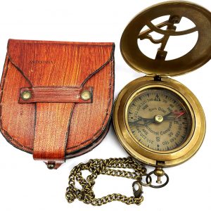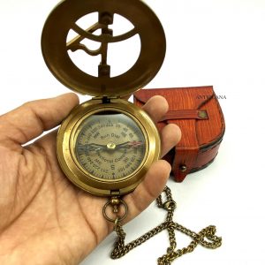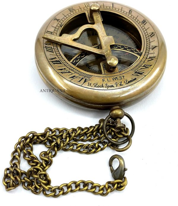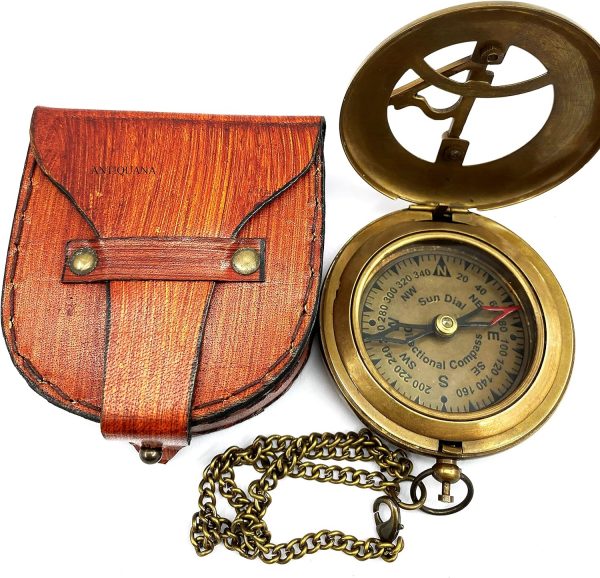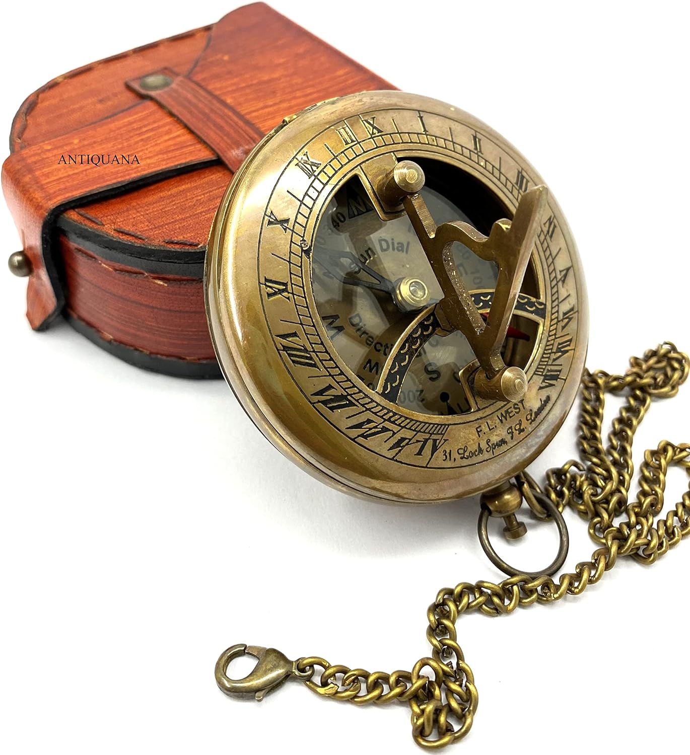 ANTIQUANA Brass Compass Unique Sundial Engraved Compass With Leather Case Antique Brass Compass With Chain A Great Gift Item For Your Loved Ones Hikers And Traveler By