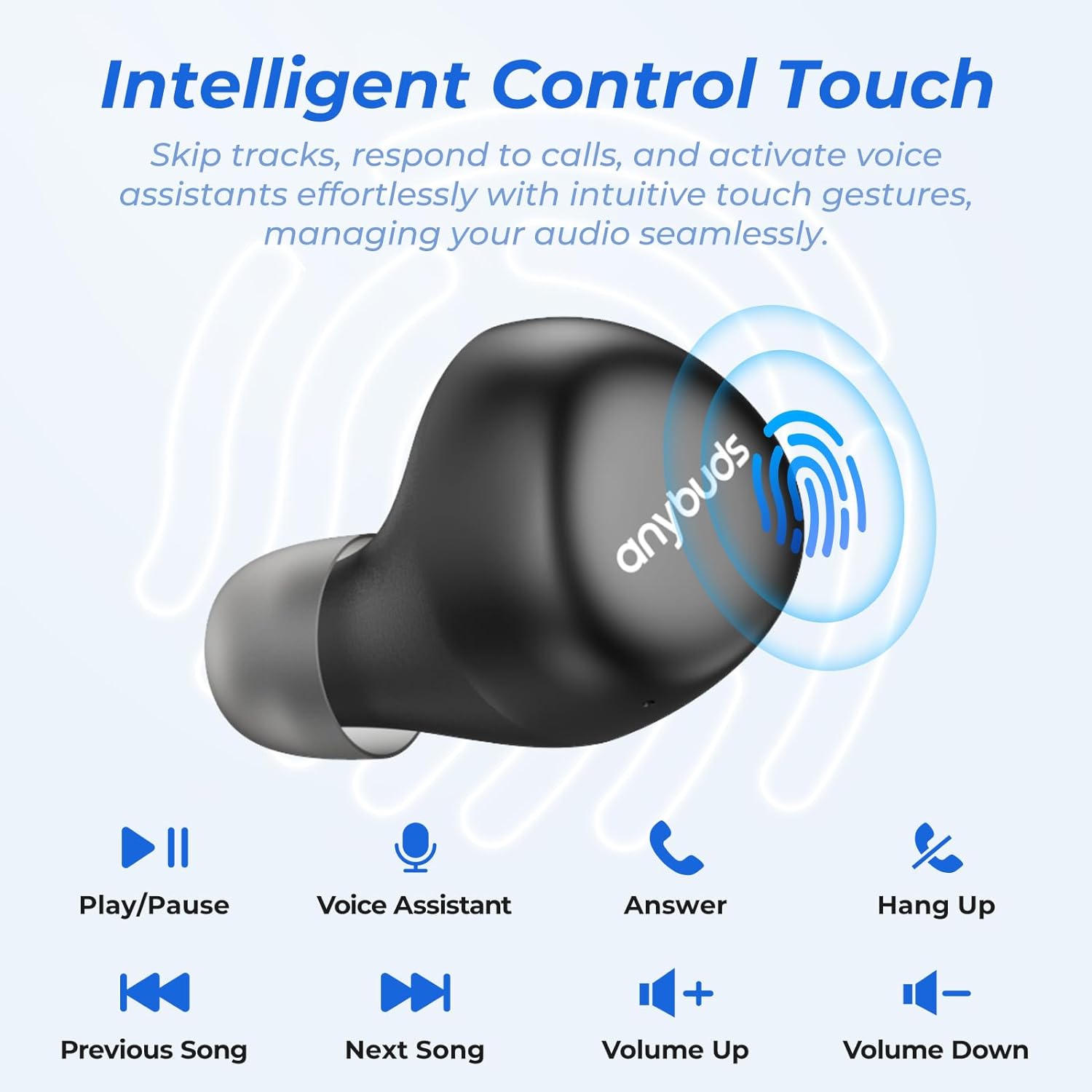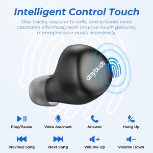 Touch controls: The Anybuds Dots earbuds feature touch controls for easy operation. Simply tap on the earbuds to play/pause music, answer/end calls.To adjust the volume, press and hold the left ear to decrease the volume, and press and hold the right ear to increase the volume.