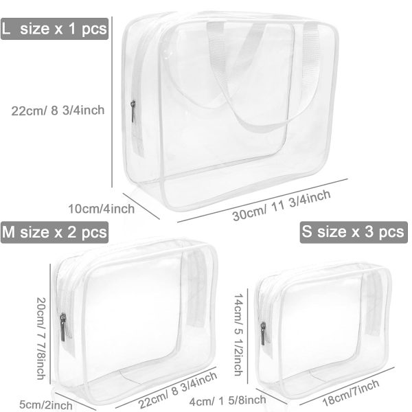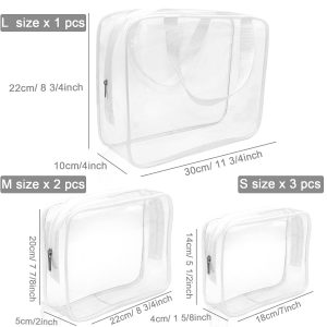 ✈6 PACKS 3 DIFFERENT SIZES✈: 1 x Large clear makeup bag, 11.81″ x 3.94″ x 8.66″; 2 x Medium clear toiletry bag, 8.66″ x 1.96″ x 7.87″; 3 x Small clear cosmetic bag, 7.08″ x 1.57″ x 5.51″. An ideal transparent cosmetic bag in travel, toiletry bag to the gym, bathroom organization, everyday carry/use bag and carry on luggage. You can also send a clear tote bag as a gift to your friends or relatives.
