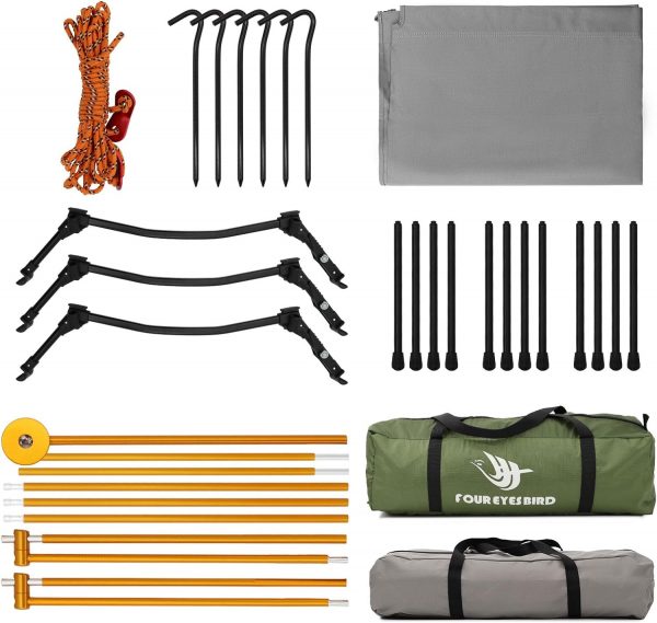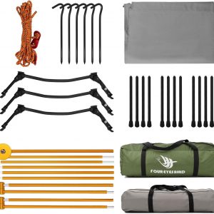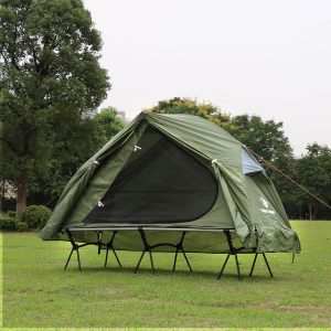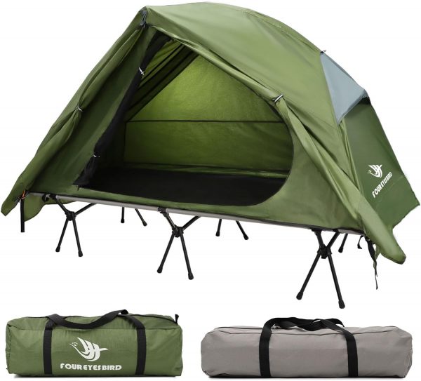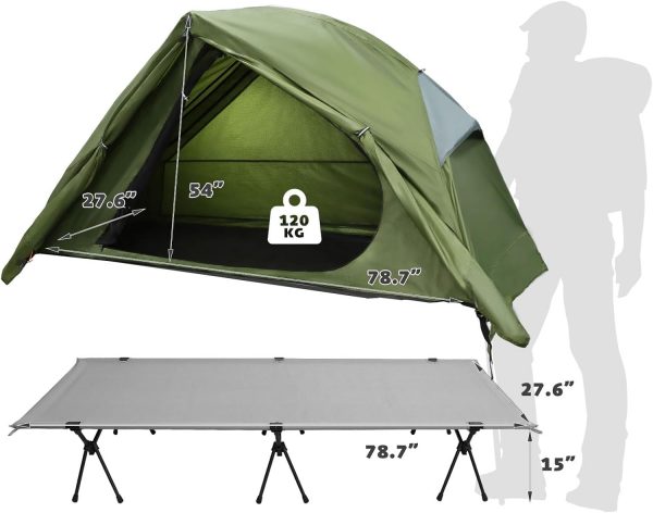 [Camping Cot Tent]: This camping tent consists of an elevated tent and a camping bed that you can use in combination or alone. The waterproof insulation fabric at the bottom of the tent will protect you from the ground and provide a comfortable dry place.[Comfortable design]: The tent has airy mesh Windows on all four sides so you can enjoy the breeze while relaxing in the tent on a sweltering afternoon. This way you can enjoy your travel time in comfort without worrying about mosquitoes flying in.[Waterproof & Windproof]: The outside of the elevated tent has a waterproof cover, which can avoid being wet by rain and effective wind protection. Made of 210T Oxford PU3000, it ensures durability to withstand different weather conditions.[Aluminum Frame]: Camping cots are made of an aluminum frame and 12 legs, this bed can easily hold up to 220 pounds. While sitting and sleeping, its frame firmly supports the camping bed, does not tip over, and is sturdy and stable.[Simple Set Up]: This bed is specially designed for one person and measures 6.56 feet by 2.2 feet. Easy to install and quick for beginners, which is very portable, light and compact. It is suitable for camping, backpacking, hiking, mountain climbing and other occasions.
