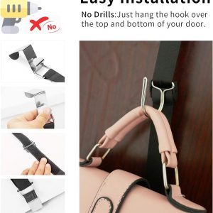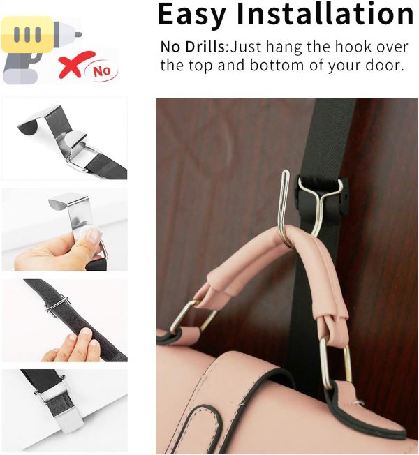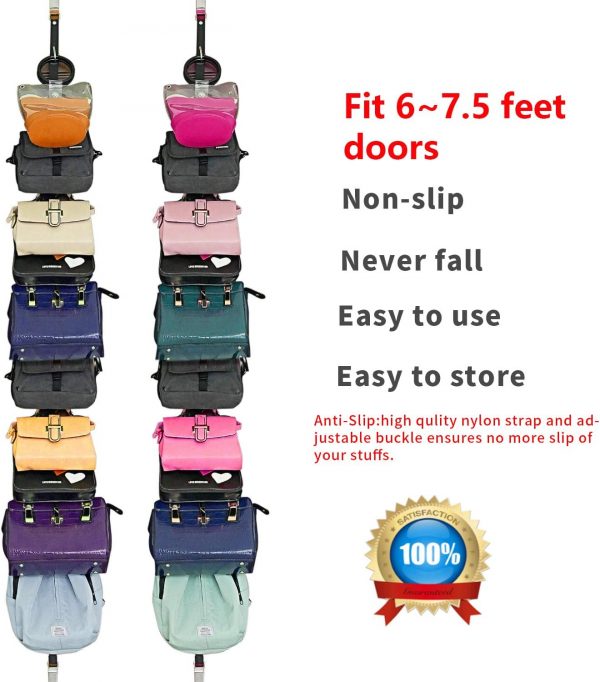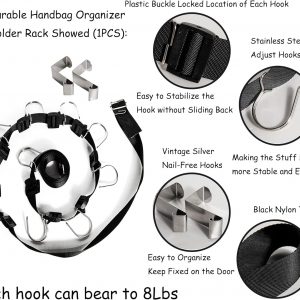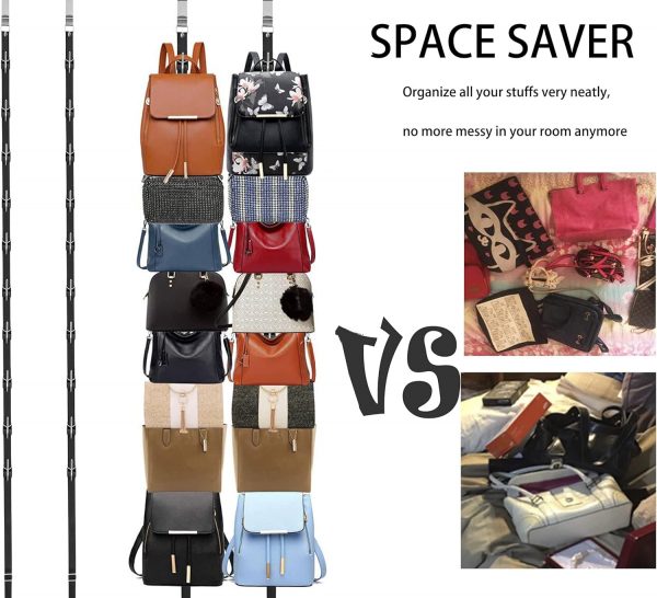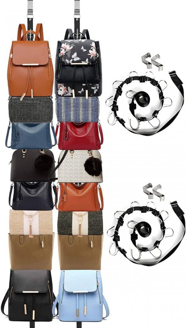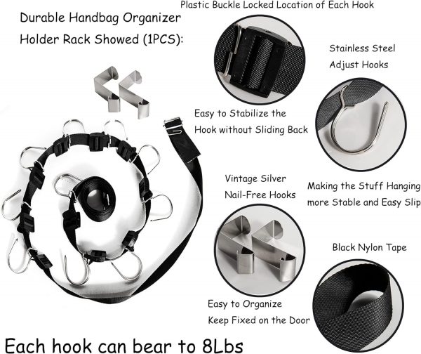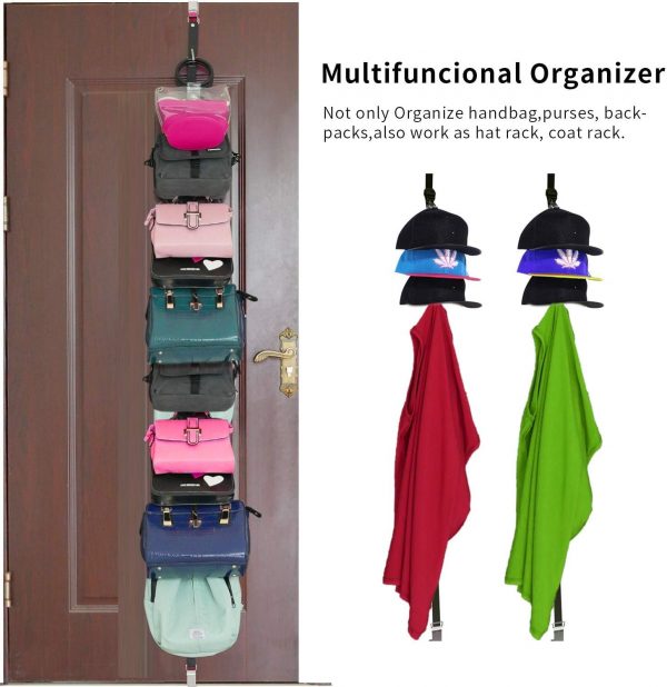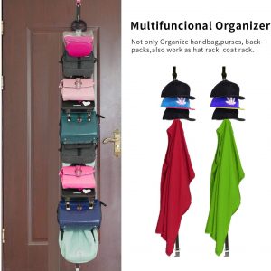 Handbag organizer :The stainless steel hook on the handbag organizer can easily Hangs over any closet rod and door,No tools required, just hang it up.The hook is very sturdy, will not falling down.