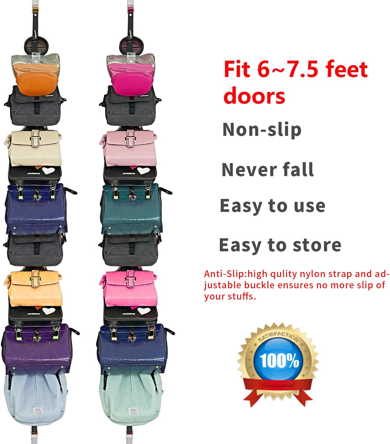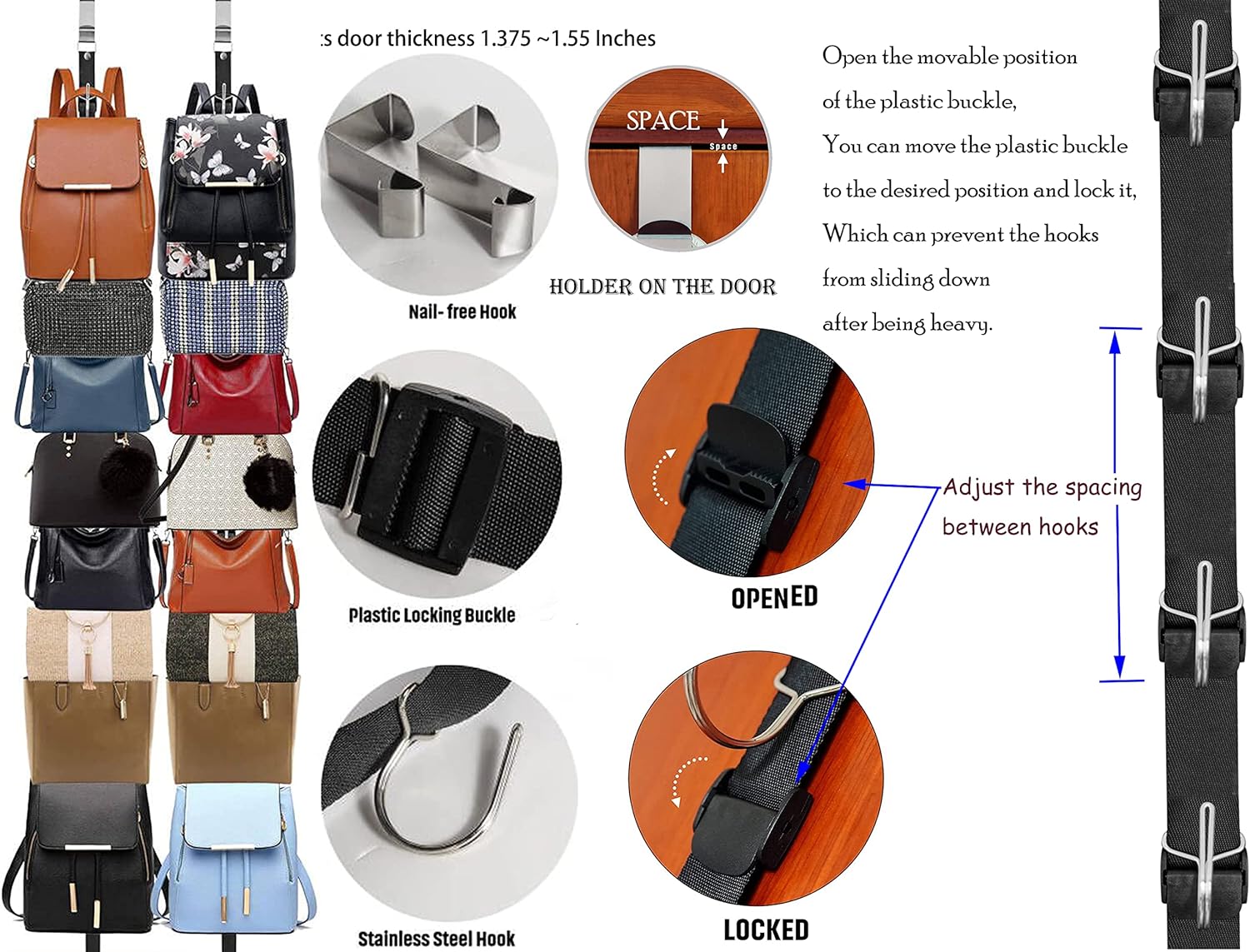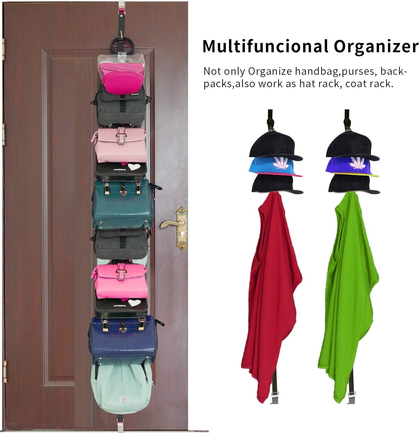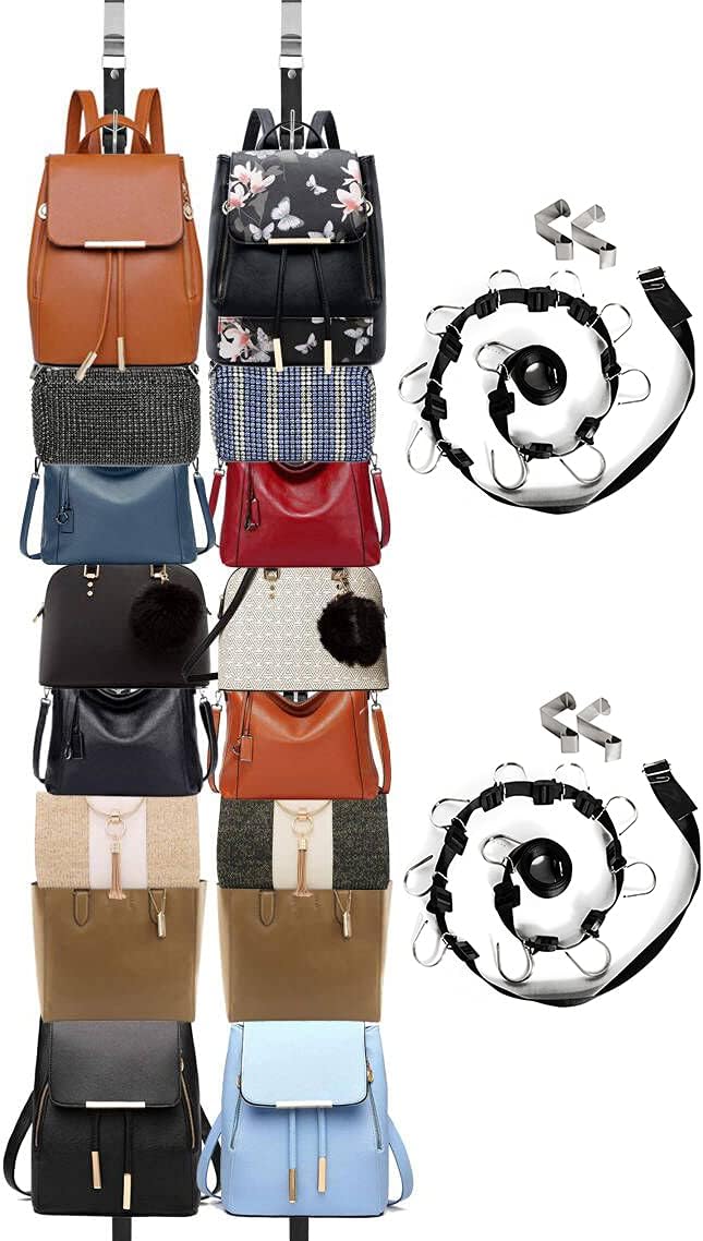 Multifuncional Organizer: Not only Organize handbag,purses, back-packs,also work as hat rack, coat rack.Find your belts, bags and hats where they belong and enjoy your new closet organizer system.You can adjust the distance between the hooks by referring to the size of the bags or the hats ect . The plastic buckle can be opened to adjust the distance, and then locked to prevent slipping.