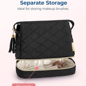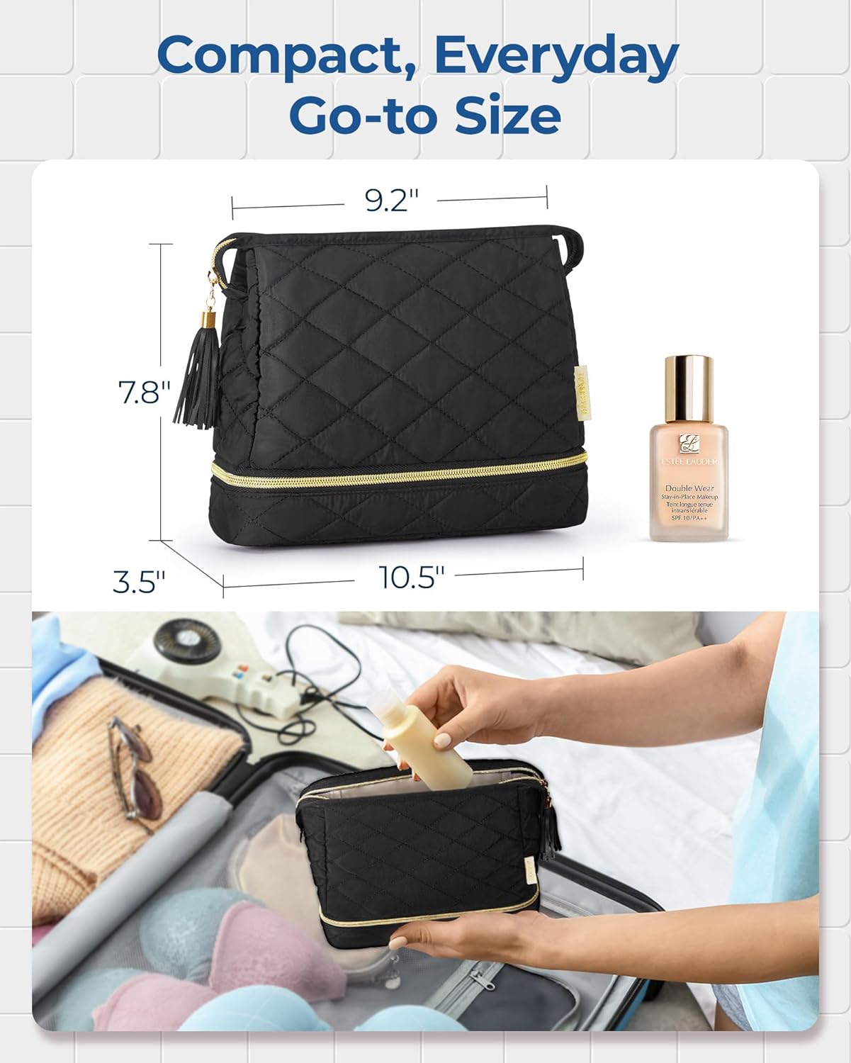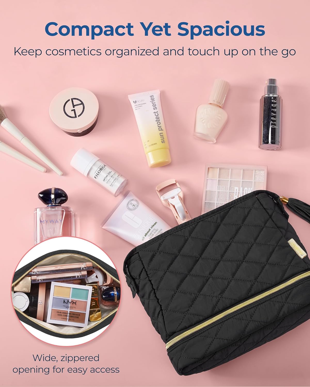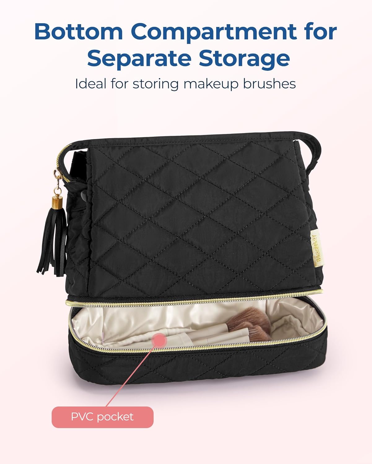 BAGSMART Makeup Bag Travel Cosmetic Bag,Puffy Make Up Bags for Women Double Layer Makeup Organizer Case,Wide-open Puffer Pouch for Purse Storage Travel Essentials Toiletries Accessories Brushes, Black