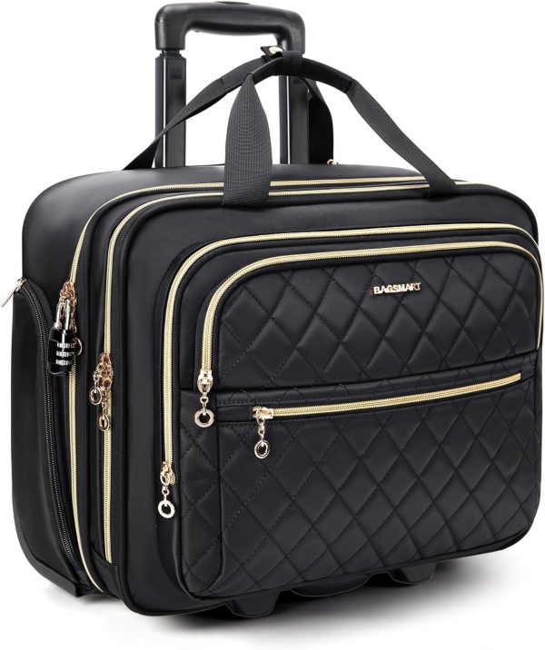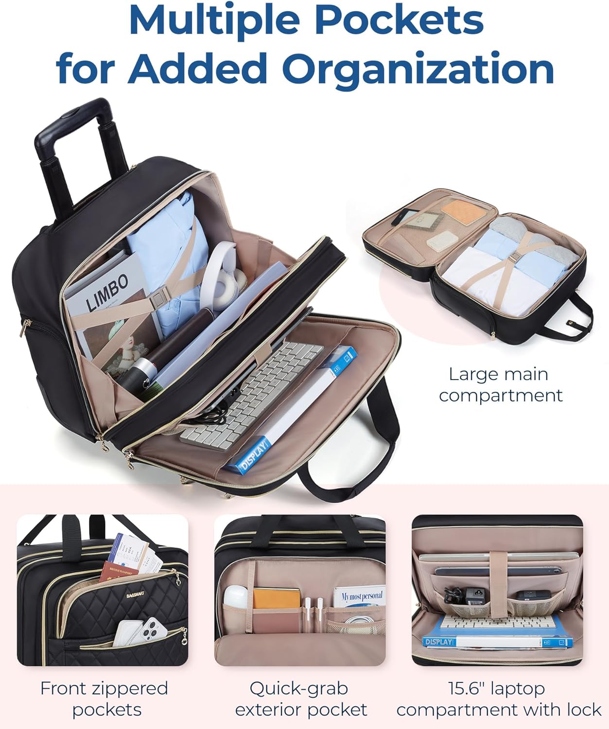 Versatile & Travel-Friendly: This BAGSMART rolling laptop bag is perfect for business and personal travel. It fits most airline overhead bins and meets carry-on size requirements. With under-seat compatibility, you can keep your essentials within reach during flights. The padded compartment protects a 15.6″ laptop.