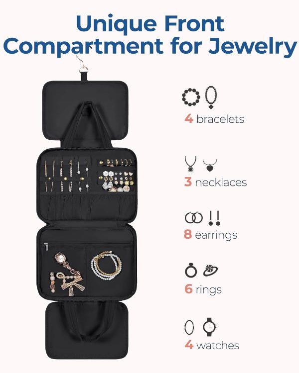 𝐉𝐞𝐰𝐞𝐥𝐫𝐲 𝐂𝐨𝐦𝐩𝐚𝐫𝐭𝐦𝐞𝐧𝐭: Bagsamrt toiletry bag is design with jewelry organizer compartment. Adding a compartment in the front pocket of travel bag for rings, ear rings, bracelets, bangles, necklaces, and other jewelries, meeting your travel toiletries and makeup needs
