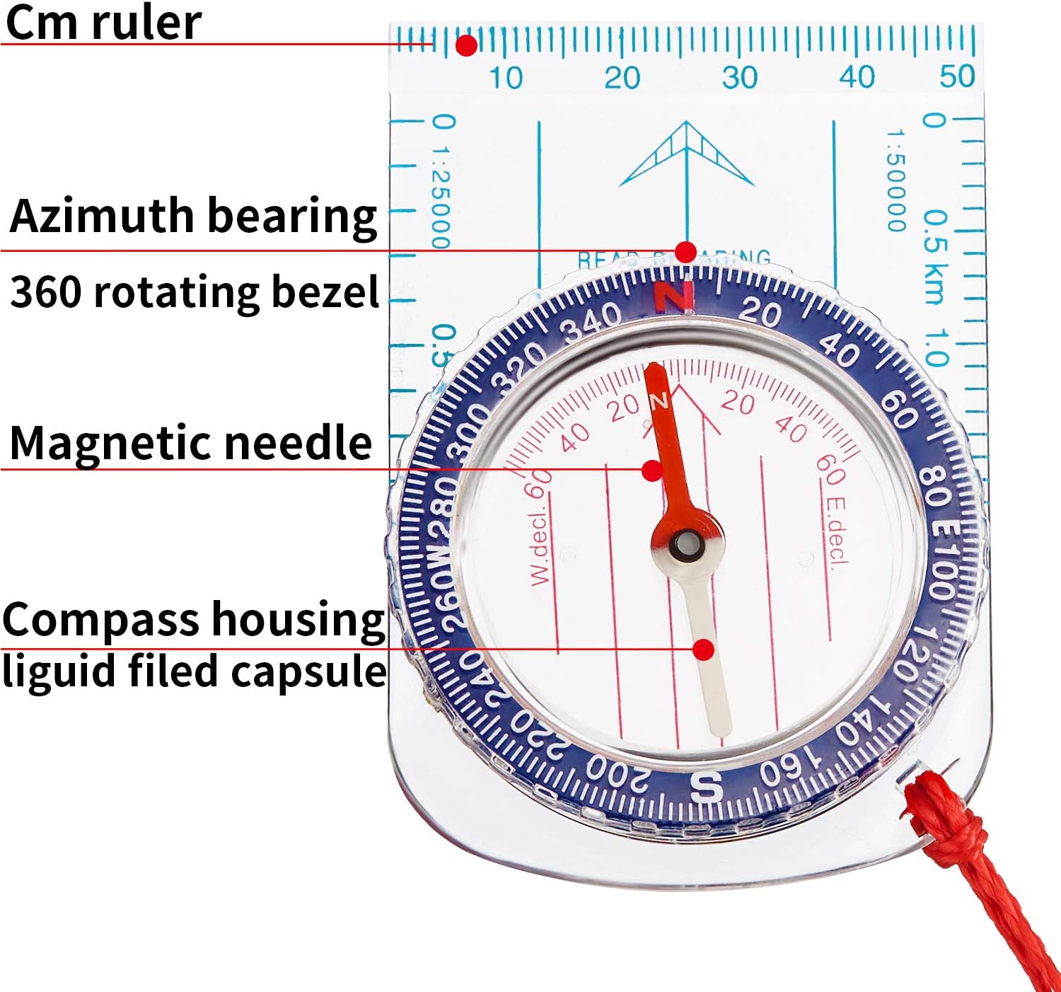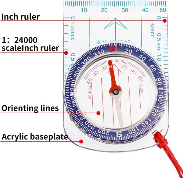 360 degree rotating bezel: acrylic baseplate compass with azimuth bearing and 360 degree rotating bezel, the plastic base is thick and durable, pointing to the magnetic north and the numbers on the bezel are easy to read; When using, please pay attention to the horizontal position, and do not put the two compasses too close, which will affect the accuracy of the compass