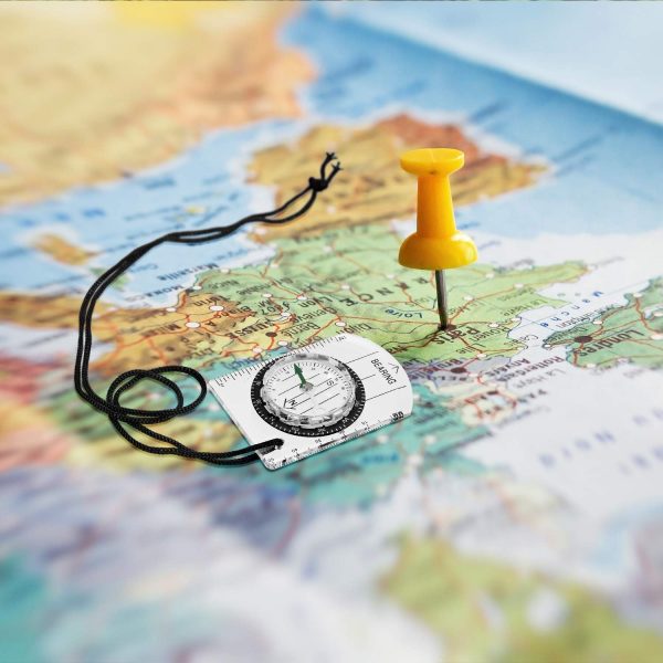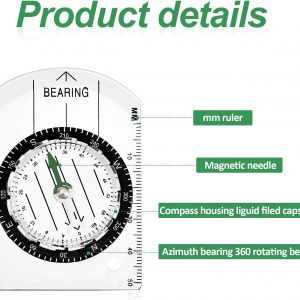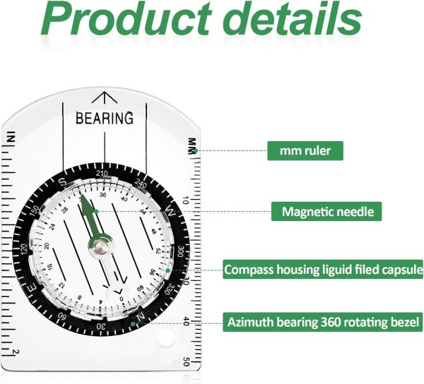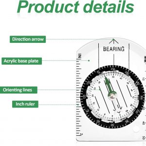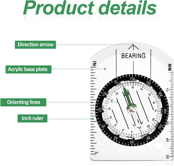 360 degree rotating bezel: acrylic baseplate compass with azimuth bearing and 360 degree rotating bezel, the plastic base is thick and durable, pointing to the magnetic north and the numbers on the bezel are easy to read