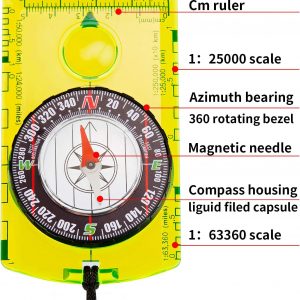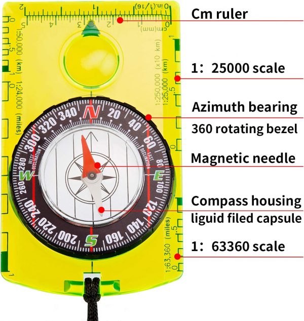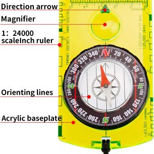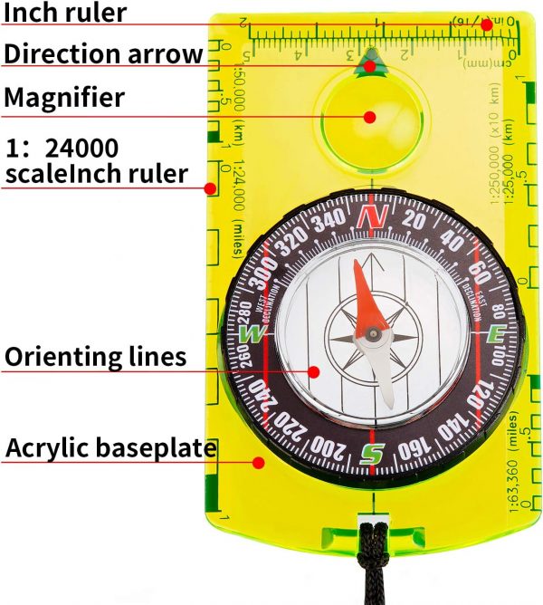 360 degree rotating bezel: acrylic baseplate compass with azimuth bearing and 360 degree rotating bezel, the plastic base is thick and durable, pointing to the magnetic north and the numbers on the bezel are easy to read