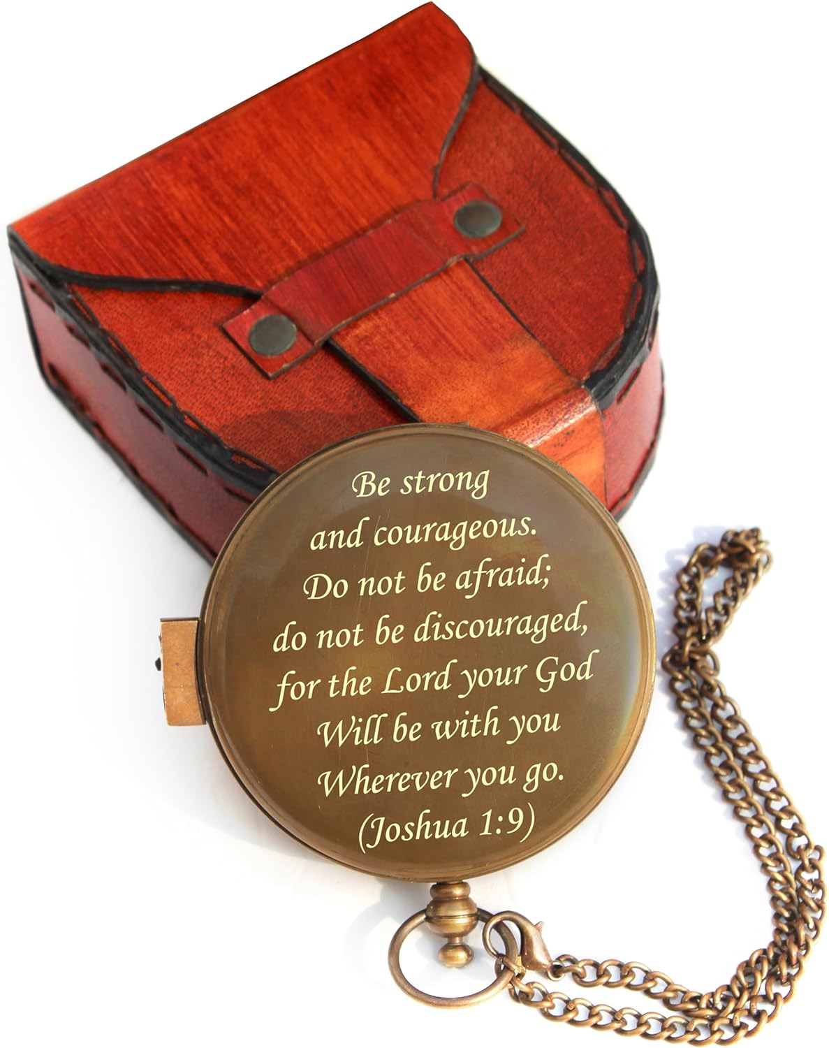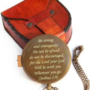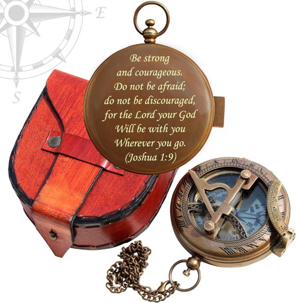 ENGRAVED BRASS SUNDAIL COMPASS WITH Joshua 1:9 “Be strong and courageous …for the Lord Your God is with you wherever you go JOSHUA 1:9” WALK YOUR LIFE PATH WITH FAITH & CONFIDENCE : Feel encouraged to accomplish your goals, with this antique handmade brass pocket compass. Always remember that God is by your side, to Guide, motivate and empower you! Size Of Compass – 3 Inch Brass Compass comes with a Brass Chain This Compass is not just beautiful decoration but also 100% working magnetic compass for hiking, boating, camping or any outdoor activity… The compass and sundial are working pieces, compass shows you accurate direction and sundial helps you know the time in a fashion people used to find it when there were no watches.