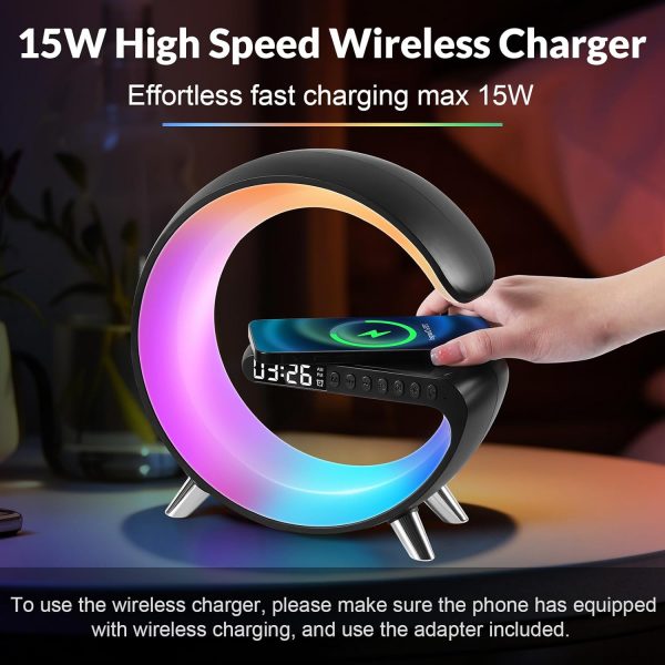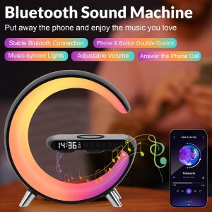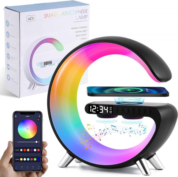 【6 in 1 Functional Smart Light】: This is a innovation for traditional table lamp. Our G shape lamp equipped with LED light, time display, alarm clock, Bluetooth speaker and wireless charging, it can serve as home decoration, night light, bedside lamp, atmosphere lamp, wake up light, digital alarm clock, portable sound machine, bluetooth call and wireless charger. One device can build a relax and peaceful home for yourself.