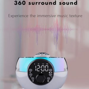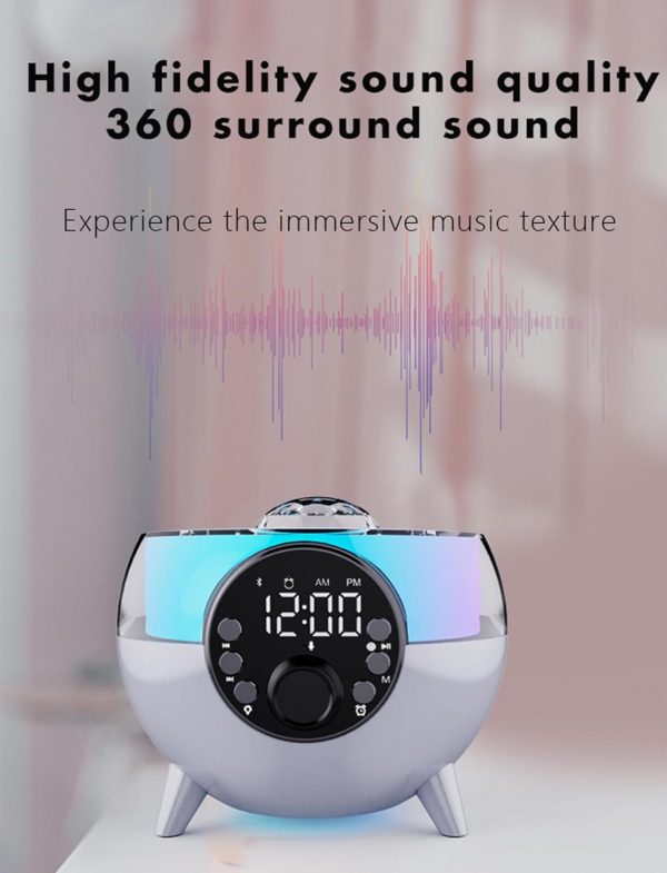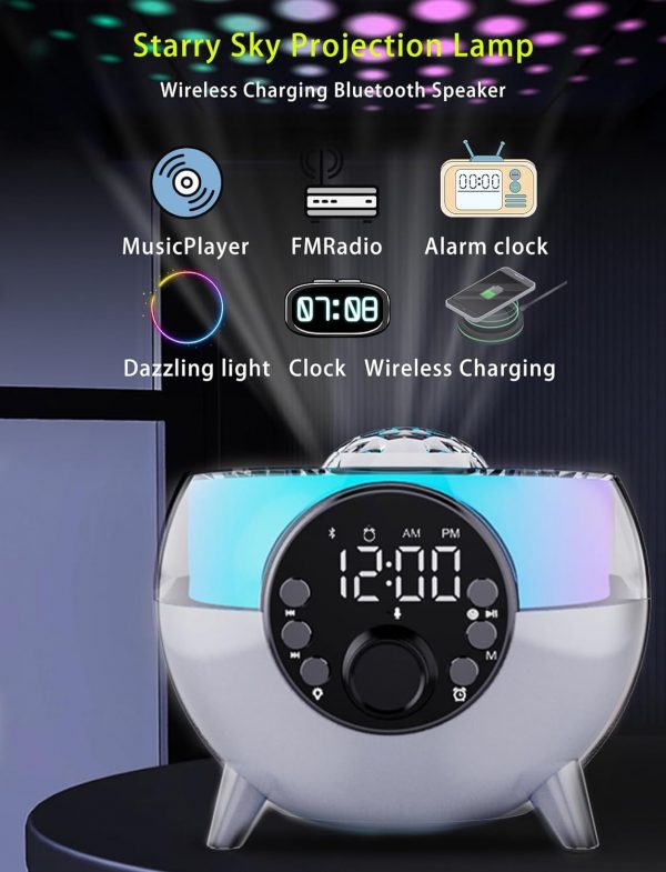 🎵[5-in-1 bluetooth audio with ambient light] – night light bluetooth speaker equipped with 15W wireless fast charger / HI-res music player / dazzling colorful projection light / night light ambient light / digital time alarm clock, to meet all your needs!