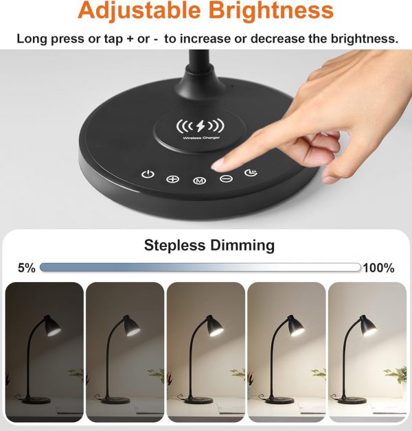 Product Name LED Desk Lamp Lamp Wattage Max 12W USB A/Type C Charging Output 5V/2A Wireless Charging Power 8 -12W LED Quantity 60 LEDs CRI 90+ Color Temperature 5 Color Modes (2700K-6000K) Dimming Stepless Dimming Power Adapter 12V I 2A Adapter INCLUDED Light Source LED bulbs (irreplaceable)