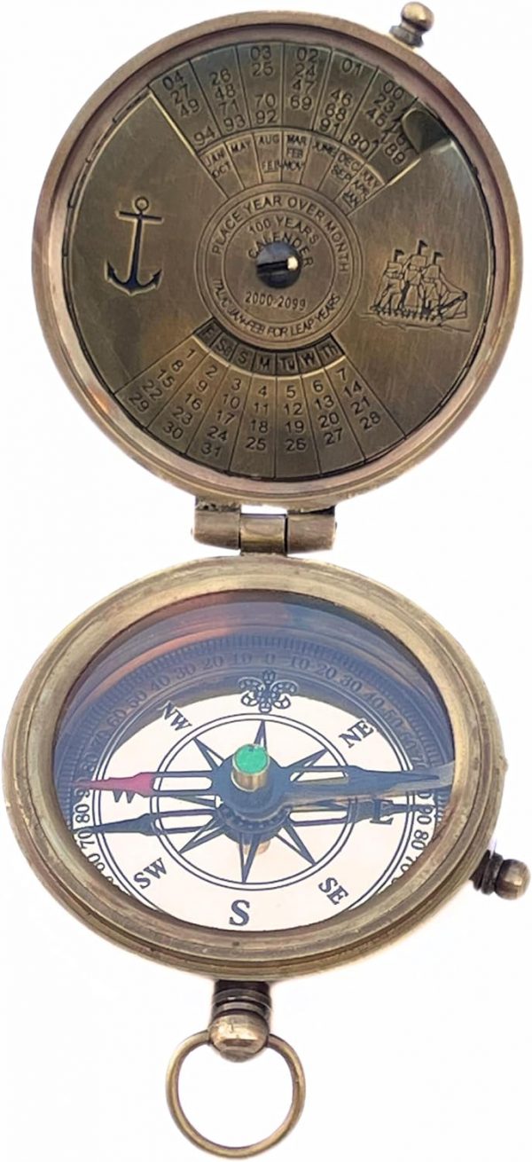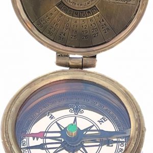 Kelvin & hughes 100 years calendar compass is very useful compass. made on handmade solid brass. A compass is an instrument used for navigation and orientation that shows direction relative to the geographic “cardinal directions”, or “points”. Usually, When the compass is used, the rose can be aligned with the corresponding geographic directions, so, for example, the “N” mark on the rose really points to the north. Frequently, in addition to the rose or sometimes instead of it, angle markings in degrees are shown on the compass.