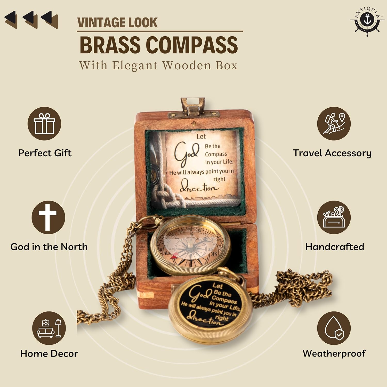 Introducing the God Compass: Your Divine Guide to Adventure and Faith! Unleash the power of faith and embark on a journey like no other with our vintage-style God Compass. This extraordinary compass is not just a navigational tool; it’s a symbol of unwavering belief and inspiration. With its timeless design and fully functional capabilities, it’s the ultimate accessory for explorers, dreamers, and those seeking divine guidance. Crafted with meticulous attention to detail, our God Compass exudes a rustic charm that transports you to the era of swashbuckling pirates and grand nautical adventures. But don’t let its vintage appearance fool you—this compass is ready to accompany you on your modern-day escapades. Whether you’re a seasoned traveler seeking new horizons or a graduate embarking on a new chapter in life, the God Compass is the perfect companion. It serves as a reminder to always stay true to your path, with its etched quote, “Let God be your Compass in life. He will always point you in the right direction.” But here’s the best part: our God Compass is not just a standalone marvel. It arrives in a stunning wooden box, making it a captivating home decor piece that adds a touch of sophistication to any space. Plus, unlike its counterparts, our compass comes in a gift-ready premium packaging complete with a greeting card, ready to delight your loved ones on any special occasion. Let’s not forget the versatility of our God Compass. It’s not only a treasured gift for graduations, baptisms, and other momentous events, but it also doubles as a beloved travel accessory. Whether you’re exploring uncharted territories or navigating through the bustling streets of a new city, this compass will be your faithful guide. So why settle for ordinary when you can embrace the extraordinary? Choose the God Compass and embark on a journey filled with faith, adventure, and countless cherished memories. Join the ranks of those who have discovered the true meaning of direction.