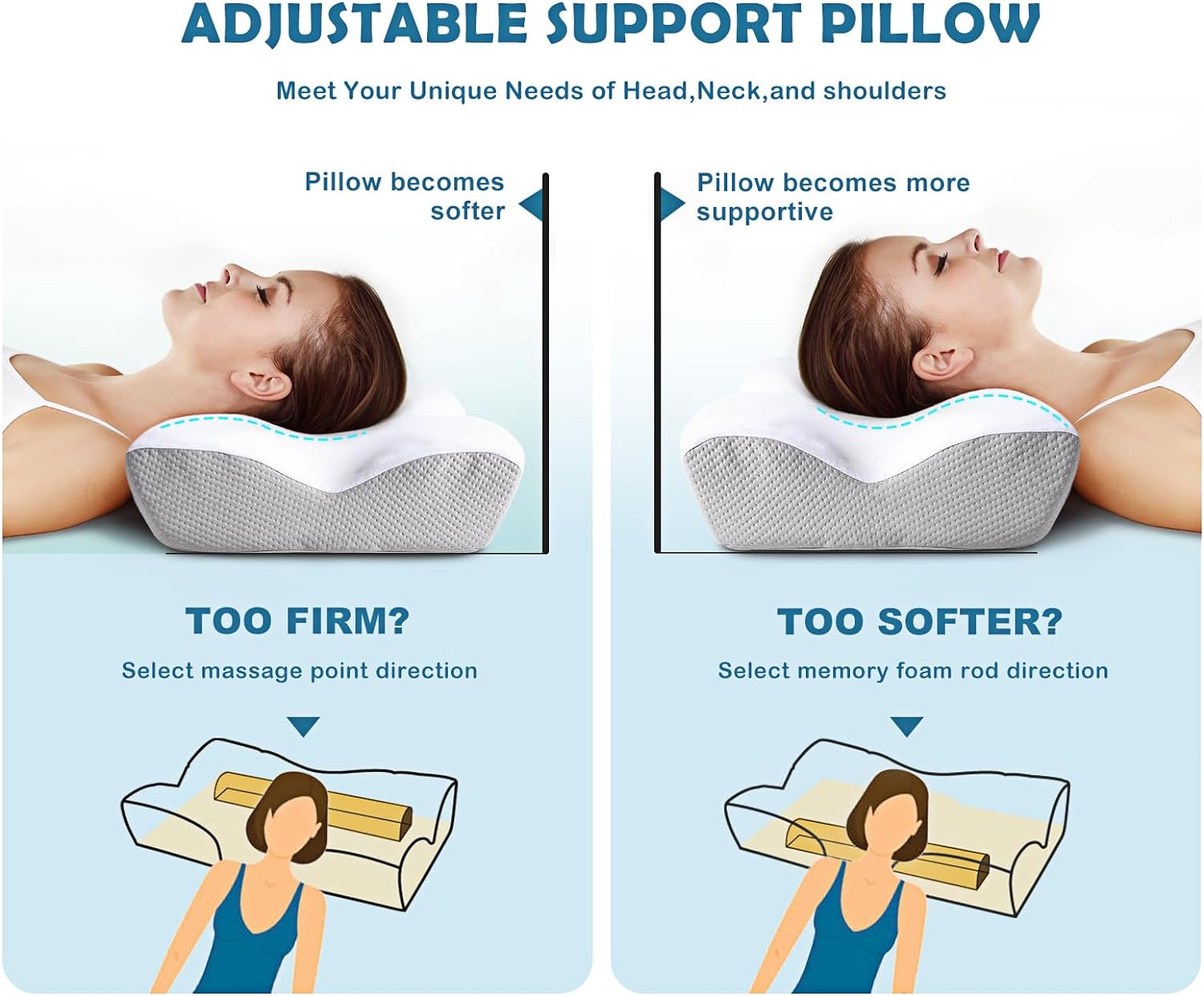 【Adjustable Soft & Firm Pillow】Trouble finding the right pillow? Can only adjust the height and still not comfortable? With our ergonomic sleeping pillow, you can adjust both the height and the firmness of the pillow. Our cervical neck pillow have an adjustable memory foam rod at the bottom of the pillow. If you want more pillow support, sleep on the side with the memory foam rod. If you want a softer pillow, sleep on the side with massage points. Support can be provided according to the natural curve of your body, so you can choose a pillow that fits you better.