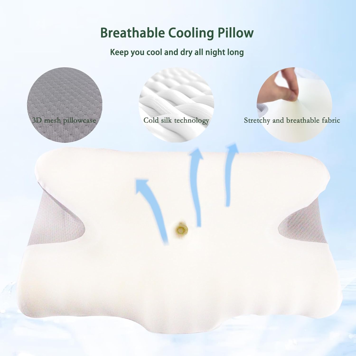 The pillowcase features two different materials , with 3 times the breathability of other contour pillow. 3D mesh fiber pillowcase was used on the back that allow heat escape and fresh air circulation. The front is made of cold silk technology fabric, which perfectly fits the skin,with soft and cooling fabric that keeps you cool all night long-allowing the skin to breathe and have a dry night!