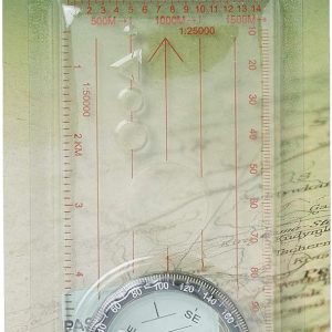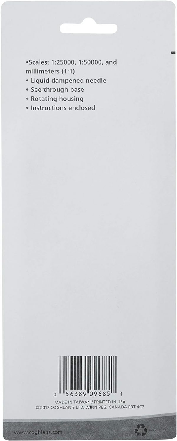 Integrated magnifier in liquid filled clear base with multiple sighting lines on rotating housing; measuring scales in Inches, mm, 1:25000