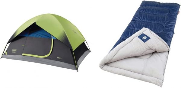 Coleman tent sets up in 10 mins with welded corners and inverted seams to keep rain out while sleeping bag has hollow fill for warmth without weight.
