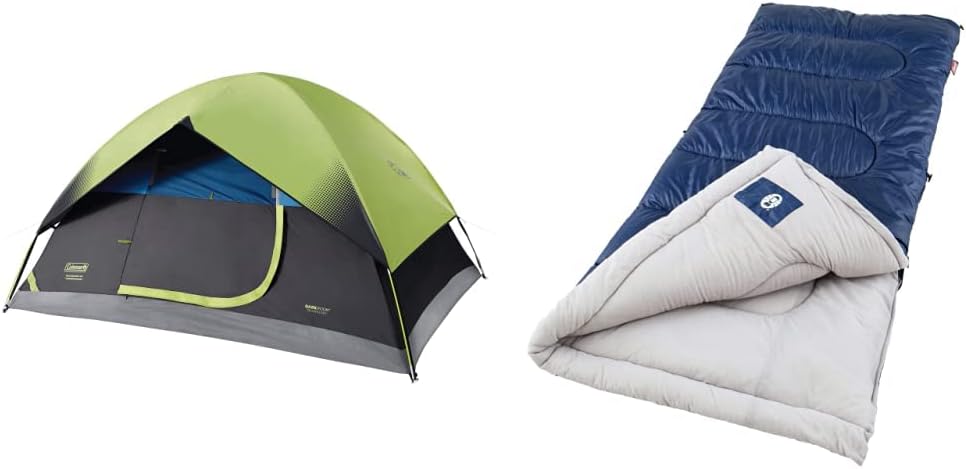 This camping bundle pairs a Coleman 4-person dome tent with a Coleman 20°F sleeping bag to keep you comfortable and protected in a variety of weather conditions. The Sundome tent blocks 90% of sunlight to allow sleeping in and reduces heat inside for a more comfortable rest any time of day. The tent is designed to keep rain out with welded corners, inverted seams, and an included rainfly. It sets up in 10 minutes and fits a queen airbed. The Brazos sleeping bag keeps you warm in temperatures as low as 20°F thanks to hollow polyester insulation that retains heat without adding weight. Its draft tube and durable construction prevent heat loss. Together, the roomy, weatherproof tent and cold-weather sleeping bag form a versatile camping bundle suitable for spring, summer, and fall trips for up to 4 people.