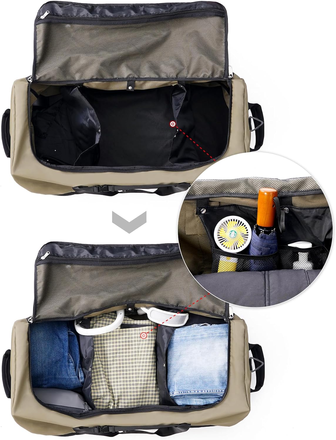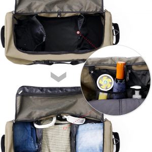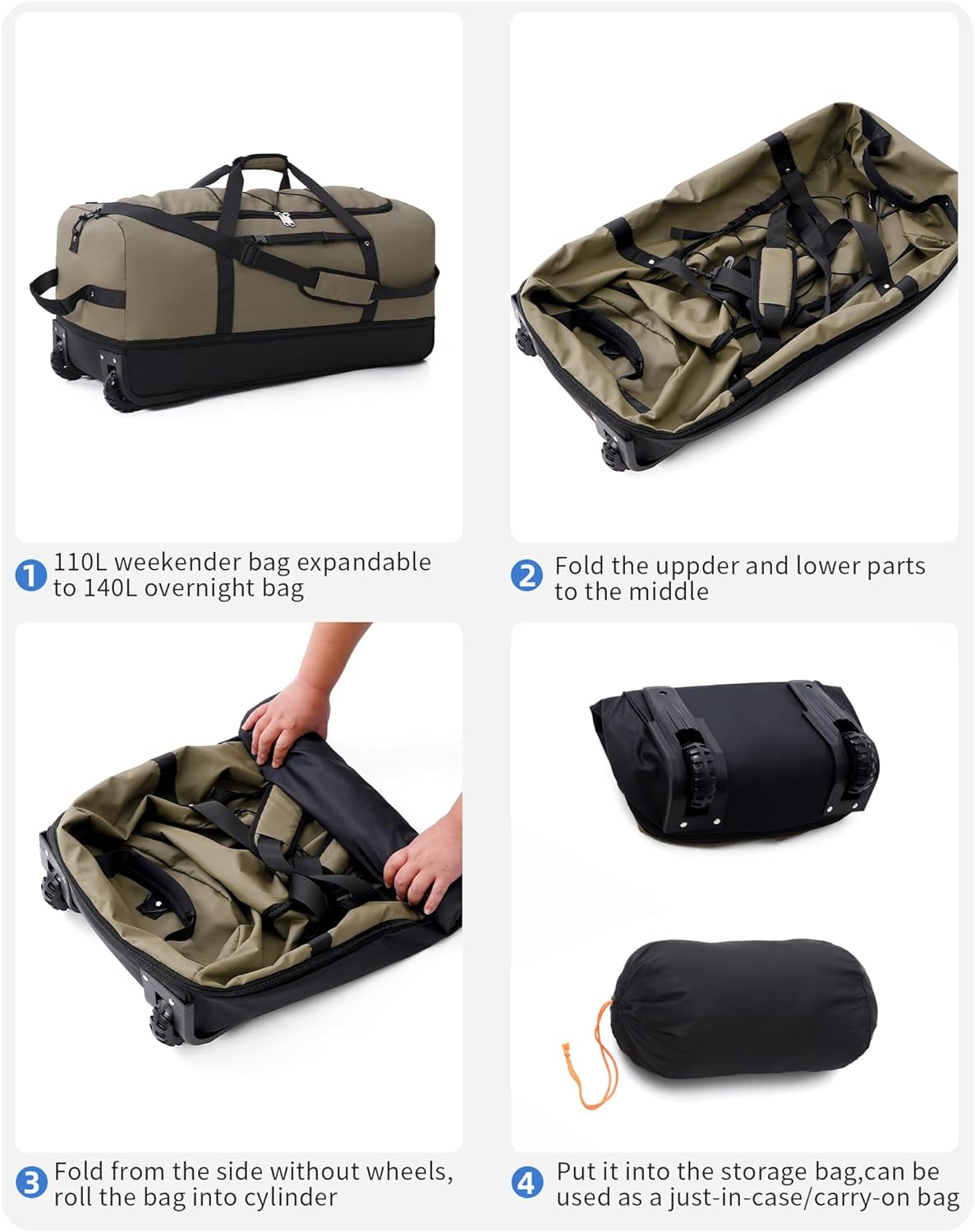 This duffel expand into a rolling travel and compact or fold itself into a small bag,making it easy for hotel,gym or home storage.Used as a family camping bag,gym bag,weekender bag,storage bag