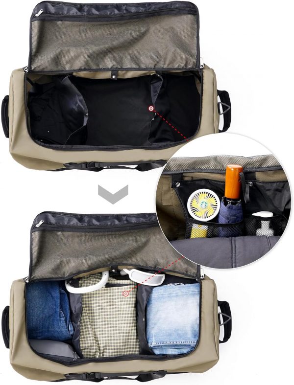 1 zipper mesh pocket for hunting gear/boating items;2 compartments convert to side accessory pockets for fitness essentials,such as gym equipment,yoga mat,badminton/tennis racket,baseball bat,ects.