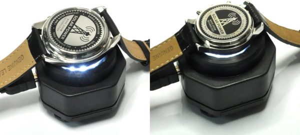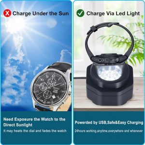 Two soft rubber caps are included for placing men’s and women’s solar wristwatches. It works for all solar watch brands and is powered by USB.