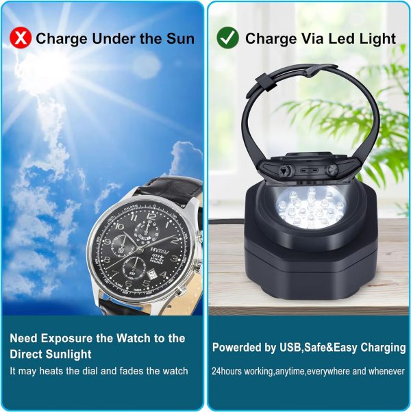 ✅ CHARGE YOUR SOLAR WATCH FASTER AND SAFER WITH OUR UV-FREE SOLAR WATCH CHARGER. It is compatible with a wide range of solar watch brands and solar watch models; our charger can power it up in no time. Just place your watch on the charger and let the UV-free light do its magic. No need to worry about overcharging, overheating, or damaging your watch.