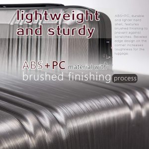 ABS+PC material, durable and lighter hard shell, features textured finish to prevent against scratches. The beveled edge design on the upper part increases toughness for the luggage.
