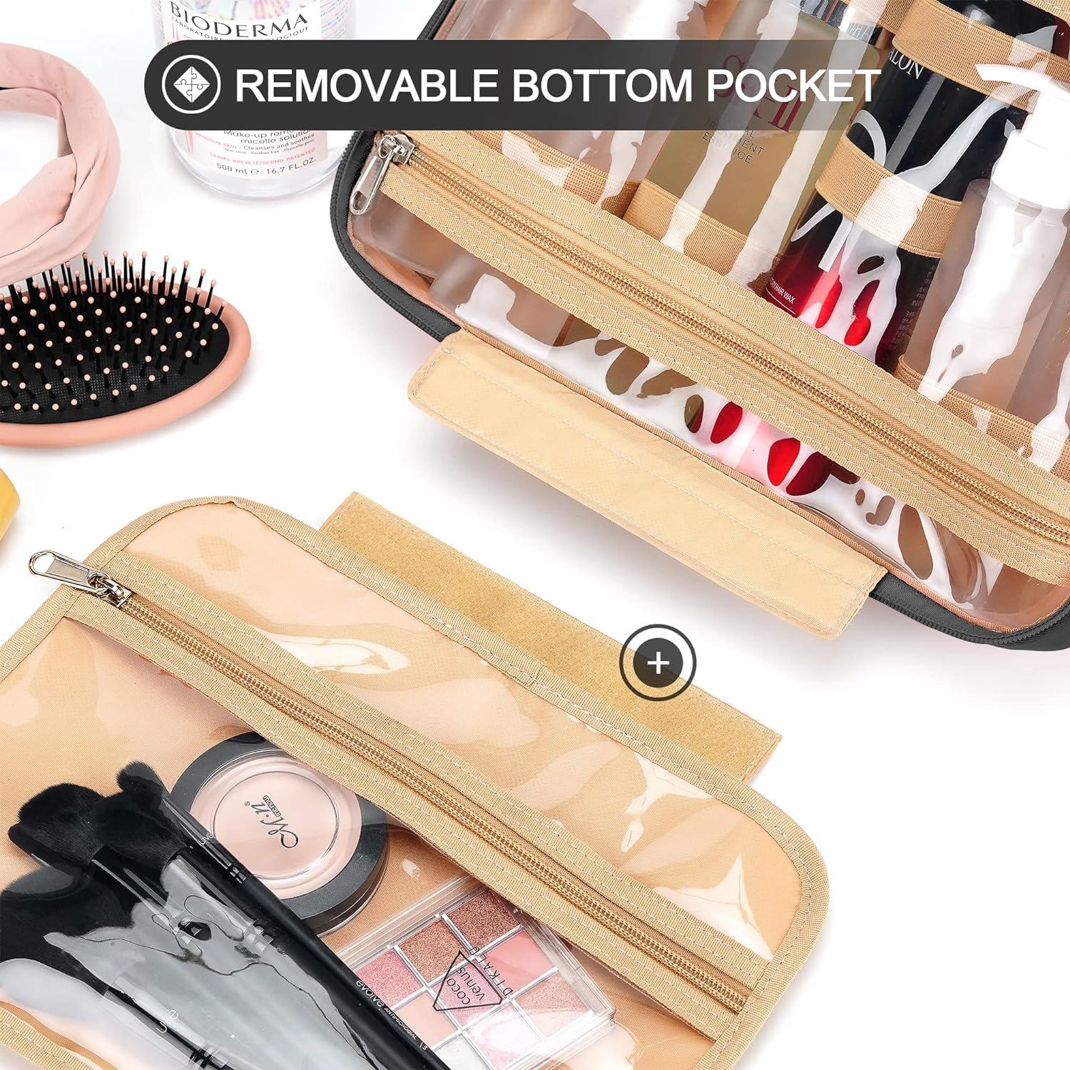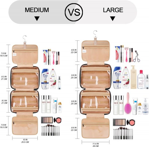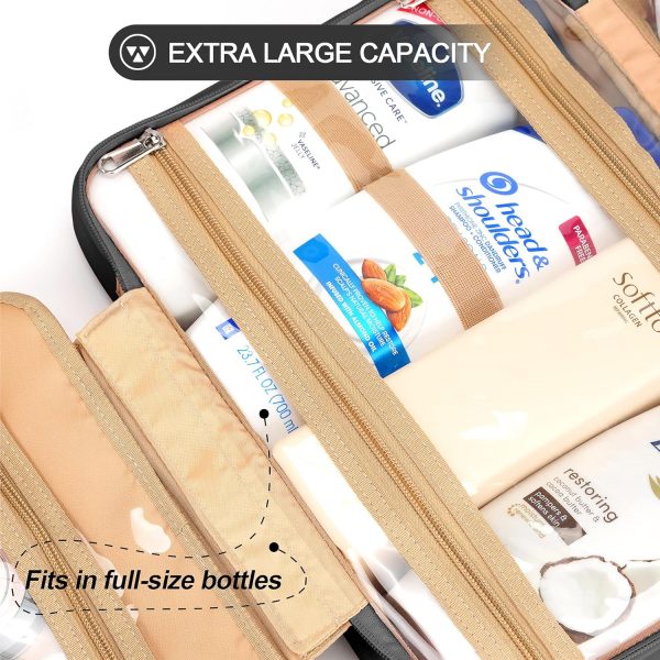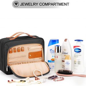COOSKY Travel Hanging Toiletry Bag for Women, Holds Full-Size Shampoo, with Jewelry Organizer Compartment, Extra Large Makeup Bag, Waterproof Cosmetic Bag, Toiletries Kit Set with Trolley Belt, Black