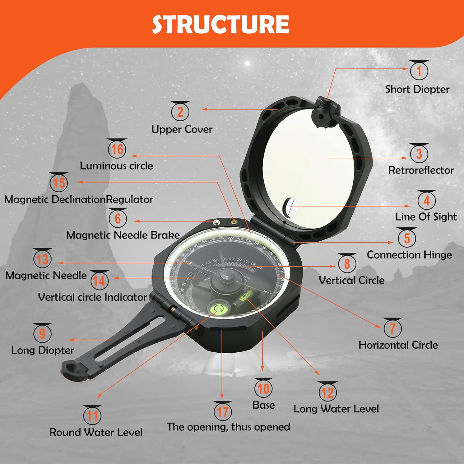 Accurate measurement of azimuth & Optical sighting lens for higher accuracy. Built-in bubble level and inch ruler & Sighting lines on the cover. Fluorescent dial, prominent at night or in poor light. High-resolution rotating bezel ring,accurate orienteering. Rear sight that magnifies function. Waterproof & Shakeproof, extreme weather condition usability,hiking or marine.