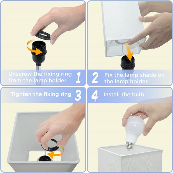 Unscrew the fixing ring from the lampholder.Place the lampshade on the lampholder.Put the fix ring back to stabilize the lampshade.Install the E26/E27 Base Bulb. (Bulb Included)