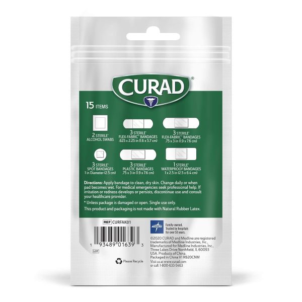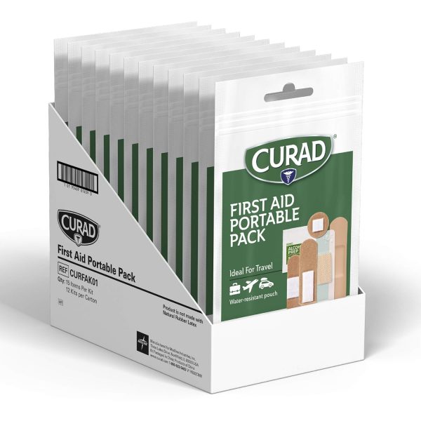 The CURAD First Aid Portable Pack, 15 count offers the first aid essentials. Great for on-the-go wound care, this Portable Pack contains everything to keep you covered when you need it most. It contains multiple sizes and types of bandages, including versatile Flex-Fabric, Waterproof, Plastic and Spot bandages. It also includes alcohol swabs to provide excellent cleansing action.