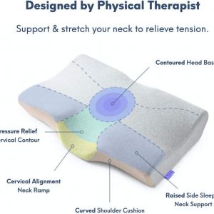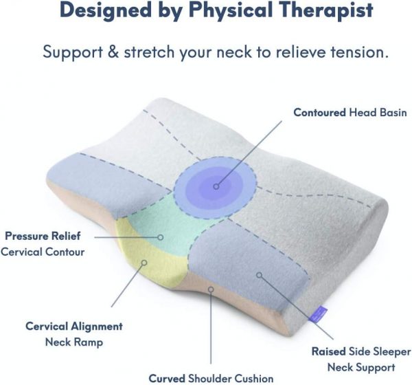 ✔【THERAPEUTIC NECK RELIEF】 Specially designed by physical therapists to perfectly cradle & align your head, neck & spine. Built-in head basin & unique neck ramp helps relieve tension and support your neck in its natural curve to enhance spine alignment. Raised cheek support lets side sleepers sleep at the optimal height and alleviate head, neck & shoulder pressure for superior comfort.